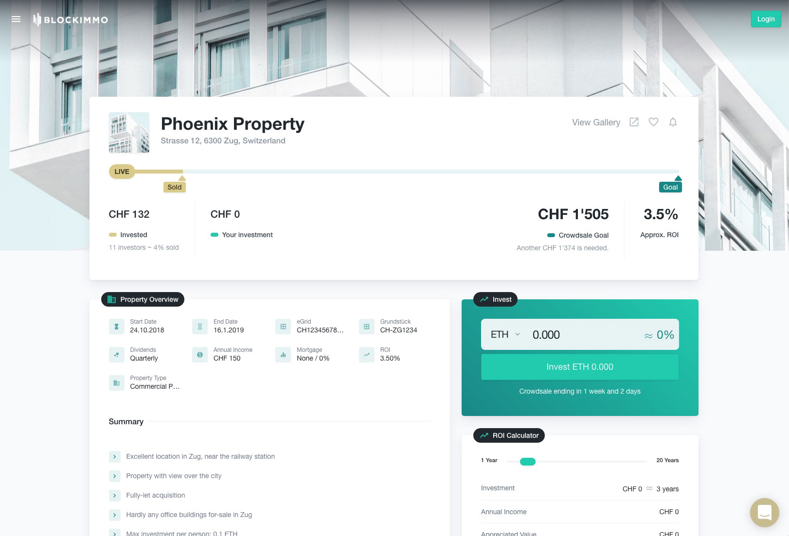 blockimmo is the world's first blockchain powered, regulatory compliant platform; our ecosystem enables shared property investments and ownership. Our platform is live! We invite you to onboard and invest in our demo property, where you will receive 3x your investment back (max. investment of 0.1 ETH). Earn approx. $30 as an early adopter! - - - It's exciting right? Investing in a piece of real estate, just as easy as you can buy a share of company. On our blockchain powered platform we tokenize real estate - and you can buy these tokens (own a piece of a property) with just one click! Please check it out on https://blockimmo.ch What's even more important, our legal structure is regulatory compliant, meaning you don't have to just take my word for it - we have received positive feedback from two financial regulators within triple-A jurisdictions (Switzerland / Liechtenstein). We introduce a clean way to synchronize a token with a property, our legal structure ensures the highest degree of investor protection. And we are transparent about it, learn more: https://medium.com/blockimmo/blo... Now, before we are going to list a real property, we are looking forward to your feedback! Please go ahead and onboard and invest in our dummy property Phoenix. Once the crowd-sale is successful you will be rewarded! We will pay out a dividend of 3 times your initial investment of 0.1 ETH, resulting in 0.3 ETH (approx. $45). And you get to test our platform again as we pay out the dividends through it (yes, you will be notified!). Alright, lot's of things to do! - Setup your Ethereum wallet (i.e. MetaMask) - Buy Ether (i.e. through Coinbase) - Invest in the Phoenix Property on blockimmo.ch - You will find our full tutorial / step-by-step guide here: https://medium.com/blockimmo/qui... ...and look at it from the bright side: you are going to setup your wallet, buy crypto etc. not for speculation / HODL but to actually use a product! :-) Have fun and we're very much looking forward to your feedback! the blockimmo team Mike Jesse & Bastiaan @waya_ai @jessengatai & @basjee --- PS: I know, I didn't touch many topics / benefits that tokenization of real estate brings, most important is probably the secondary market, where we turn an illiquid asset into something liquid and make it easy tradable. This, and a lot more topics we cover in several detailed blog posts. https://medium.com/blockimmo Are you interested? Please read them here and do reach out to us if you have an idea for collaboration (partnership, license, whitelabling, etc. - we are very open to talk!).