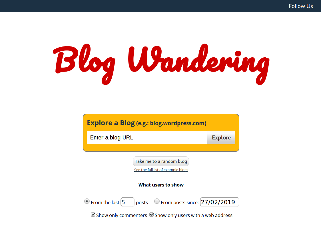 Blog Wandering is a free tool that allows a user to explore a WordPress blog visually. You choose a blog from which to start and you get a map composed of the author and of her/his commenters, then you can click on a commenter and open the map of her/his blog, and so on. For each user, the Gravatar and the user's URL are shown. Double clicking on the Gravatar opens the URL in a new tab, while right-clicking opens the Gravatar profile. You can select the number of posts analyzed by Blog Wandering, as well as choose to select them starting from a date. You can zoom and pan the map, drag the users, delete and select them, scroll automatically to a user, and see the blogs you explored. You can even take a snapshot of the map.