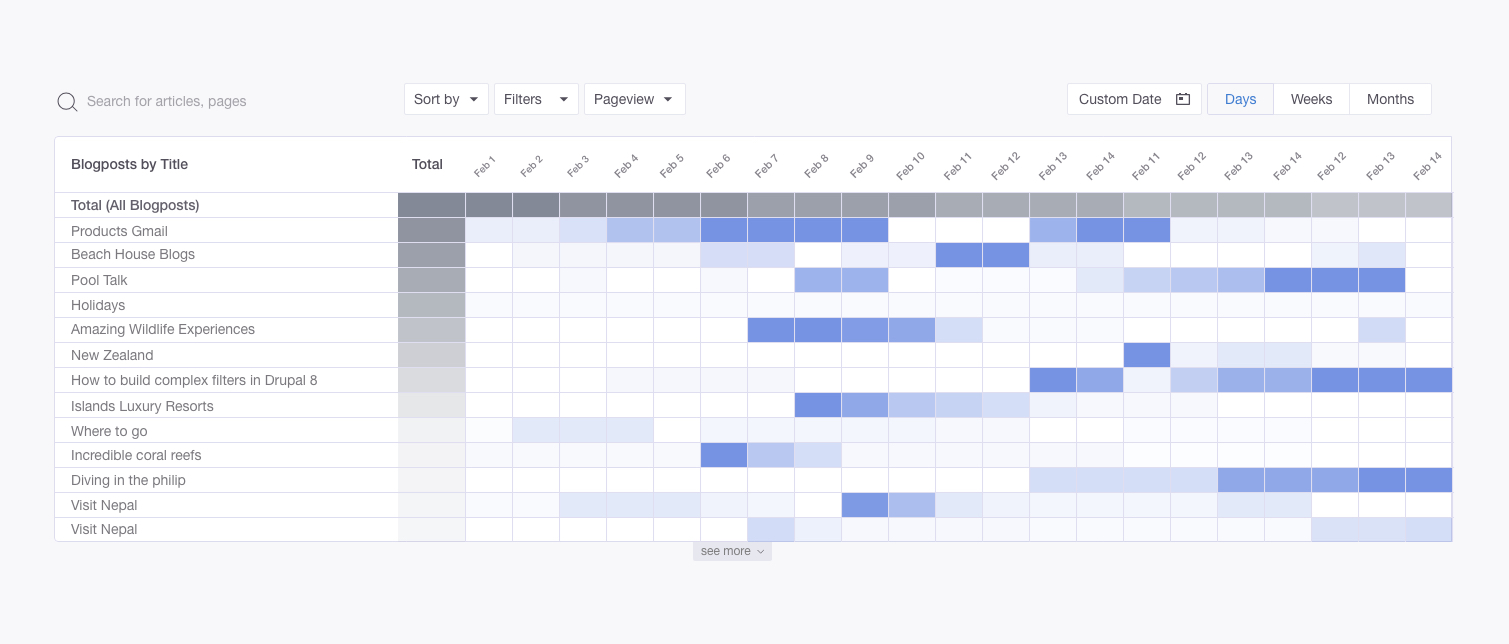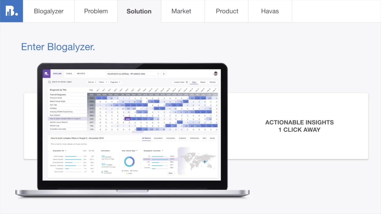 Blogalyzer is an intuitive & visual tool that helps you track, understand and optimise your content marketing, with a minimum amount of clicks. [Optimise your strategy through actionable insights] See historical growth, what content works, what doesn’t and what to (re-)distribute, all from a glance at our intuitive dashboard. [Get answers to your questions in just one click] Get all the relevant acquisition, conversion & audience metrics for your articles in just one click, instead of hundreds in Google Analytics. [Automatically report on your progress] Get automatic weekly email reports and empower your team to use dashboards to make timely, data-driven decisions. More features (A.I. Daily Tasks, Integrations, ROI & Competitor Insights...) to come. Follow our progress on www.blogalyzer.net Beta Launch on 15th of April 2019