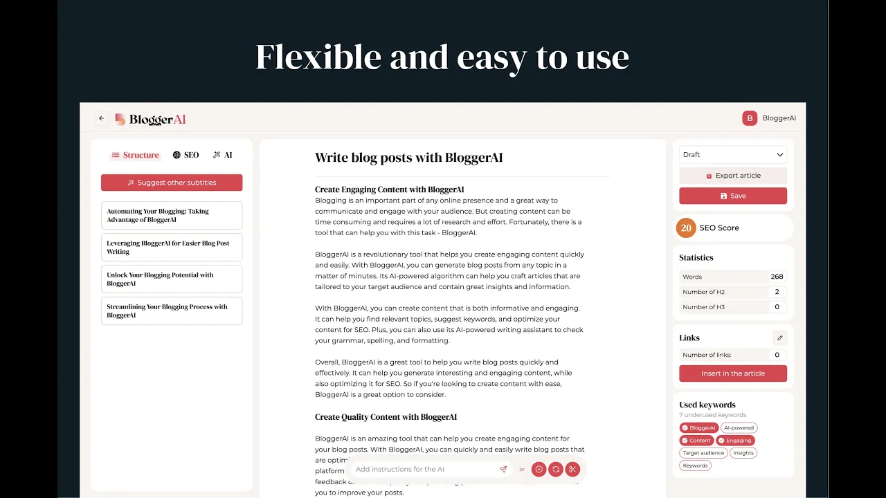 BloggerAI is an AI-powered content editor that allows you to write, optimize, and rewrite blog posts quickly and easily. With advanced SEO tools and 10+ languages support, it helps you increase your rankings and unlock your writing potential.