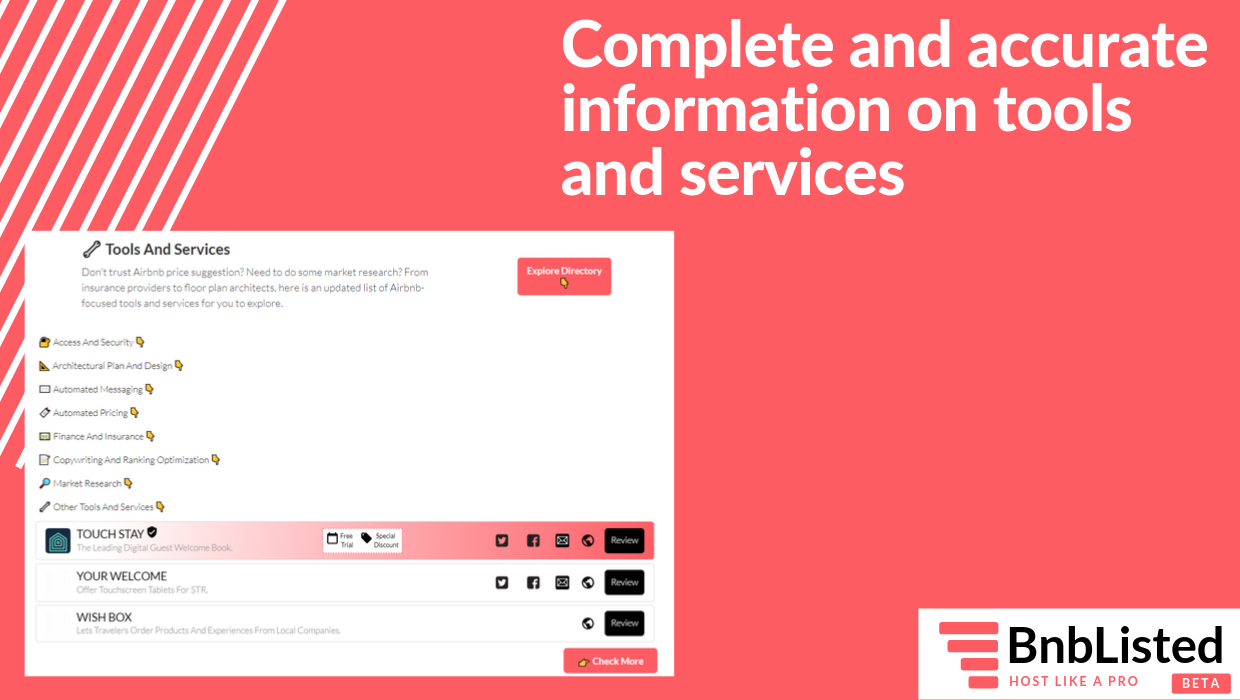 I'm excited to share with you BnbListed, a curated directory of resources, tools and solutions for Airbnb and short-term rental hosts! This personal side-project features: - Airbnb-related tools and services; - A directory of SaaS solutions; - A curated list of physical products; - A list of recommended resources. Future features include: - Interviews with successful Airbnb hosts and property managers: We ask them all about their personal background, how they started out, the growth and marketing strategies they used, and the mistakes they have committed in the process so that the readers can avoid them; and - "Hire an Expert" - A property management firms directory: A list of Short-Term Property Management Firms, with the goal to connect landowners and investors with local consultants and agencies. The whole project took ~25 hours (including idea, design and development) and was built with a ZERO budget. Feel free to connect :)