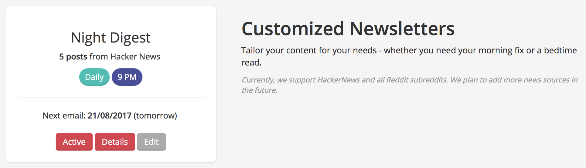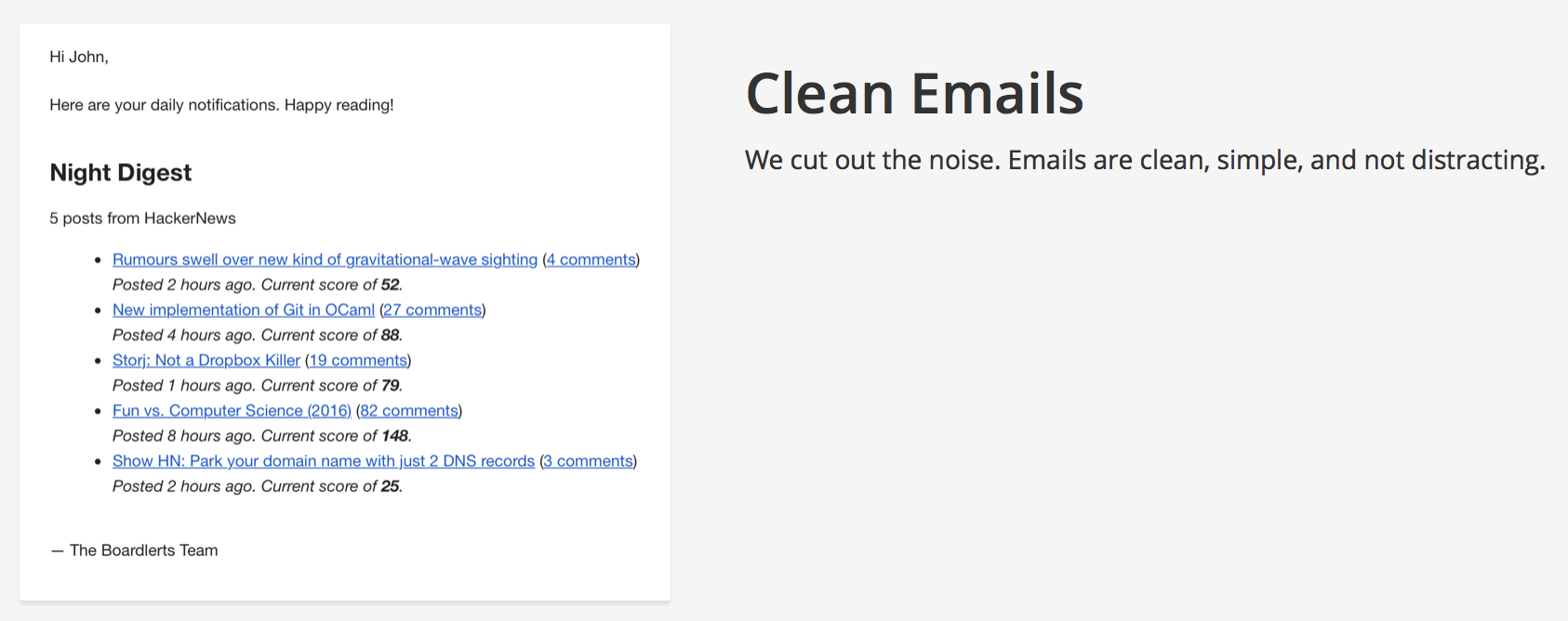 Boardlerts is a service that sends posts you care about directly to your inbox. Currently, it supports posts from Reddit and HackerNews. The idea for Boardlerts came about when I realised that there were many subreddits and boards that I was interested in but never really followed closely, mostly because I forgot or just didn't have the time to. Boardlerts solves this problem - it emails me a summary of the posts I'm interested in, saving me time and effort to monitor these subreddits or boards. Everyday at 8am and 9pm, I receive clean emails showing me the top posts from HackerNews and some subreddits I follow. It’s great because I don’t spend all day refreshing these sites, yet manage to catch up on more important news.