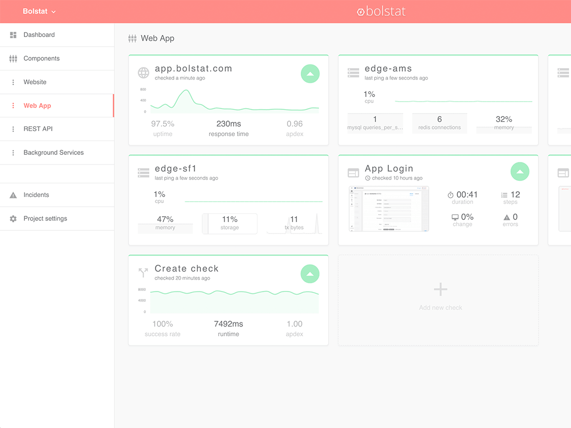 Bolstat is an easy all-in-one solution to keep tabs on your software. Get notified of any problems affecting your Saas with smart notifications that respect your team's schedules. Easily set up a full range of checks via our dashboard for an affordable price. No excuses to postpone this crucial aspect of your business anymore. Bolstat replaces a broad range of expensive products. We monitor and test your website uptime, API performance, servers and regularly check the client-side apps through browser testing. More check types are added regularly.