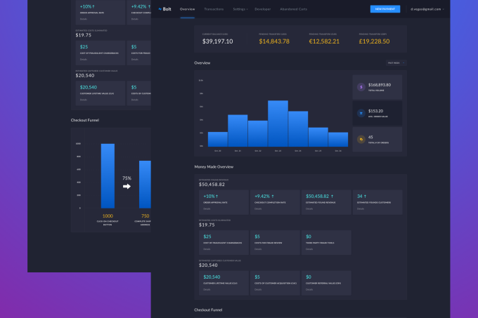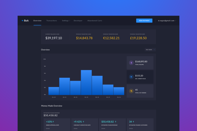 End-to-end payments that drive ecommerce businesses 10%-50% newfound revenue. -STOP LOSING CUSTOMERS AT CHECKOUT. High-friction checkouts lead to lost revenue and unhappy customers. Leverage Bolt’s hyper-optimized checkout for a serious lift in conversion rates. -APPROVE MORE ORDERS. NO FRAUD, NO FEAR. Bolt’s next-generation fraud algorithms approve more orders than any other tool in the industry. Bolt also covers 100% of fraudulent chargebacks.