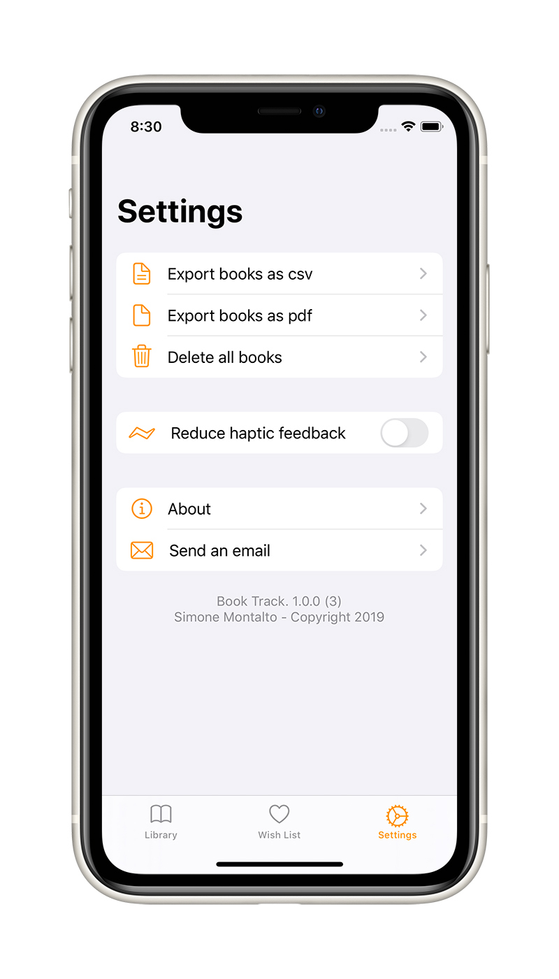 Book Track allows you to easily keep track of the books you've purchased or would like to buy. You can add a new book to the collection or to the wish list by searching for it by title, author or ISBN, by scanning the barcode or by entering it manually. The entire collection is automatically synchronized on all the devices connected to your Apple account via iCloud. During the development of Book Track, I wanted to focus a lot on ease of use, creating an app that fully integrates with the operating system in terms of user experience and UI.