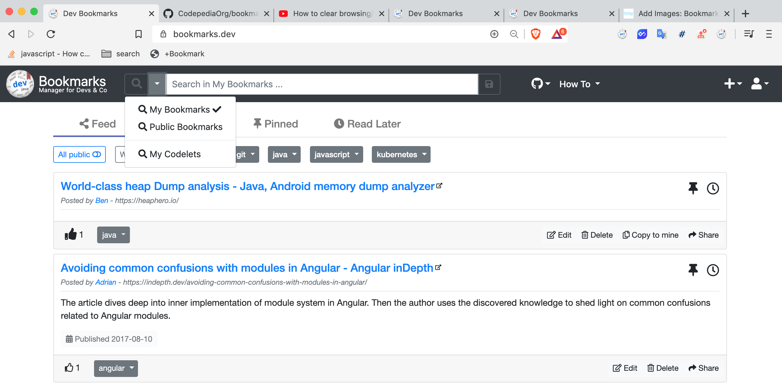 Bookmarks.dev was created to address the struggle with the management of dev bookmarks (think of the thousands upon thousands of pages in your enterprise wiki) and code snippets (in what project and file I put that code that did that thing), aka codelets. It's now an indispensable tool in my developer toolbox, featuring among others : - easy saving of bookmarks and code snippets via bookmarklets and chromium extension - tag first approach with auto-completion of tags - follow tags and other users - saving your searches - useful metadata for developers, like source code url, the date when published, or video duration for youtube videos - open source, so you know what happens with your data (pull requests are always welcomed) Check out our HOW TO page to get you started: https://www.bookmarks.dev/howto