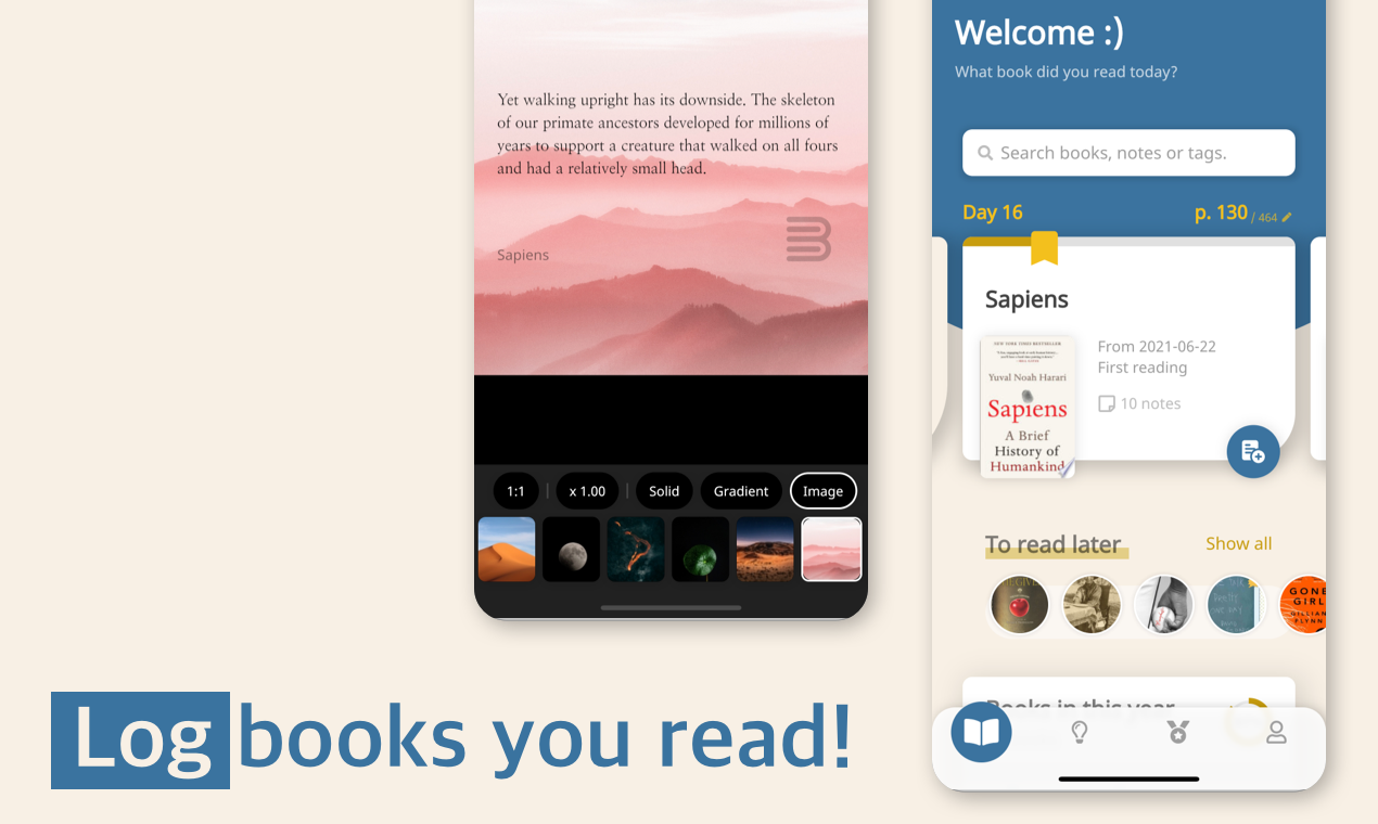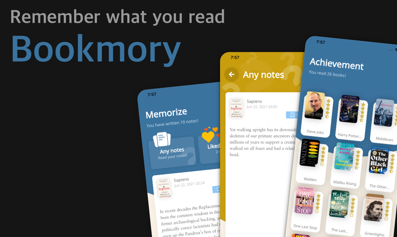 Bookmory helps you track your reading, manage your books, build a lasting reading habit, and better remember what you read. Add books, e-books or audiobooks to your bookshelf. Use the timer to track your reading. Improve your reading habits with insightful stats. Stay motivated with reading goals. Remember what you read by writing and reviewing notes. * Easily register books by author or title. * Keep a record of how many pages you read. * Manage your books with various tags. * Create stylish notes with our powerful editor. * Underline your favorite phrases. * Share your notes with beautiful backgrounds. * After reading the book, please leave a rating and book review. * After reading the book, Bookmory will praise you. * Please feel refreshed as you watch the books you read pile up. * Try powerful and beautiful stats features. * With Google Cloud Backup, you don't have to worry about losing the hard-written data. * Protect the app from people around you with a password. In addition to this, powerful additional features are planned. You can look forward to more in the future!