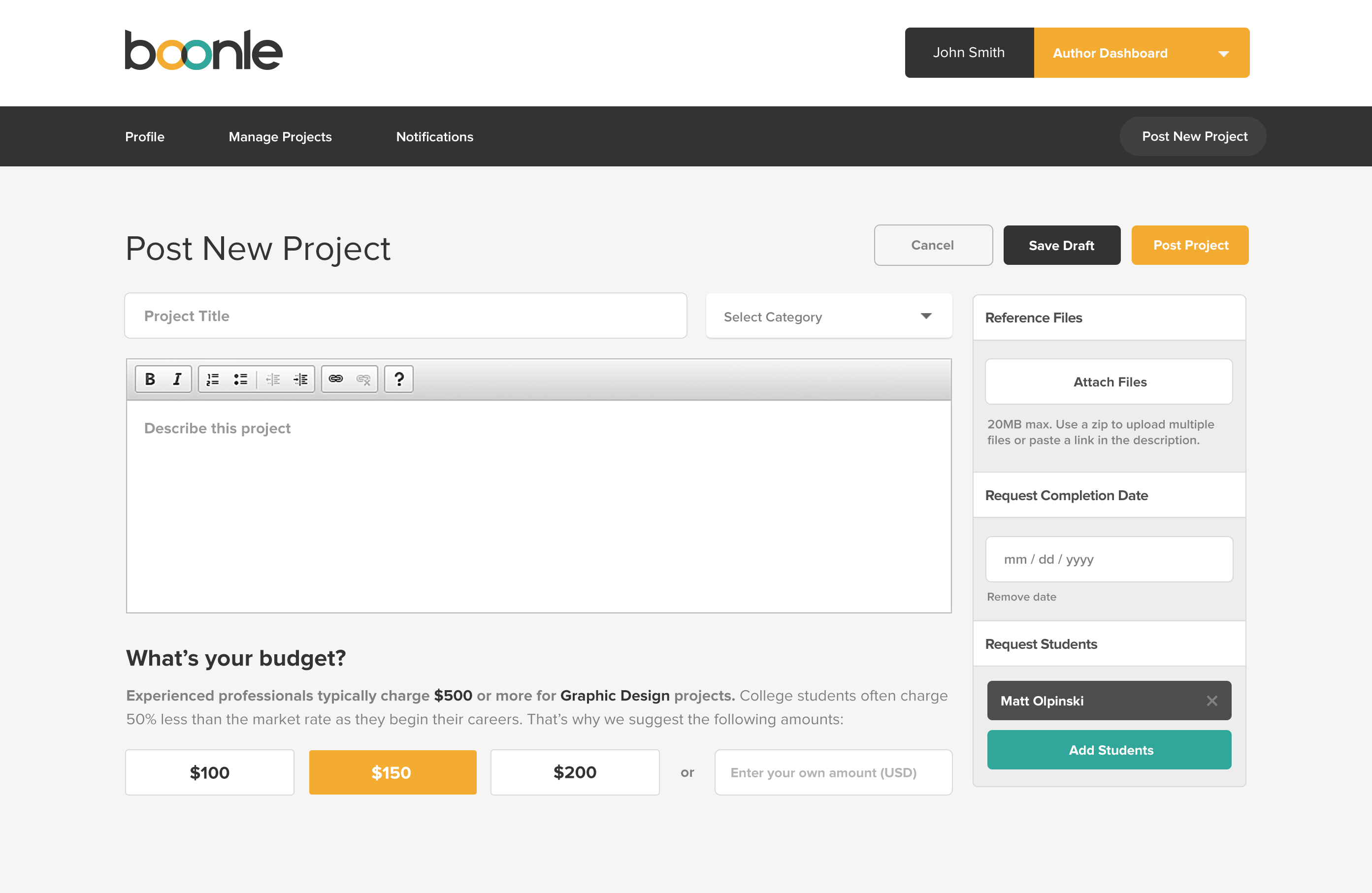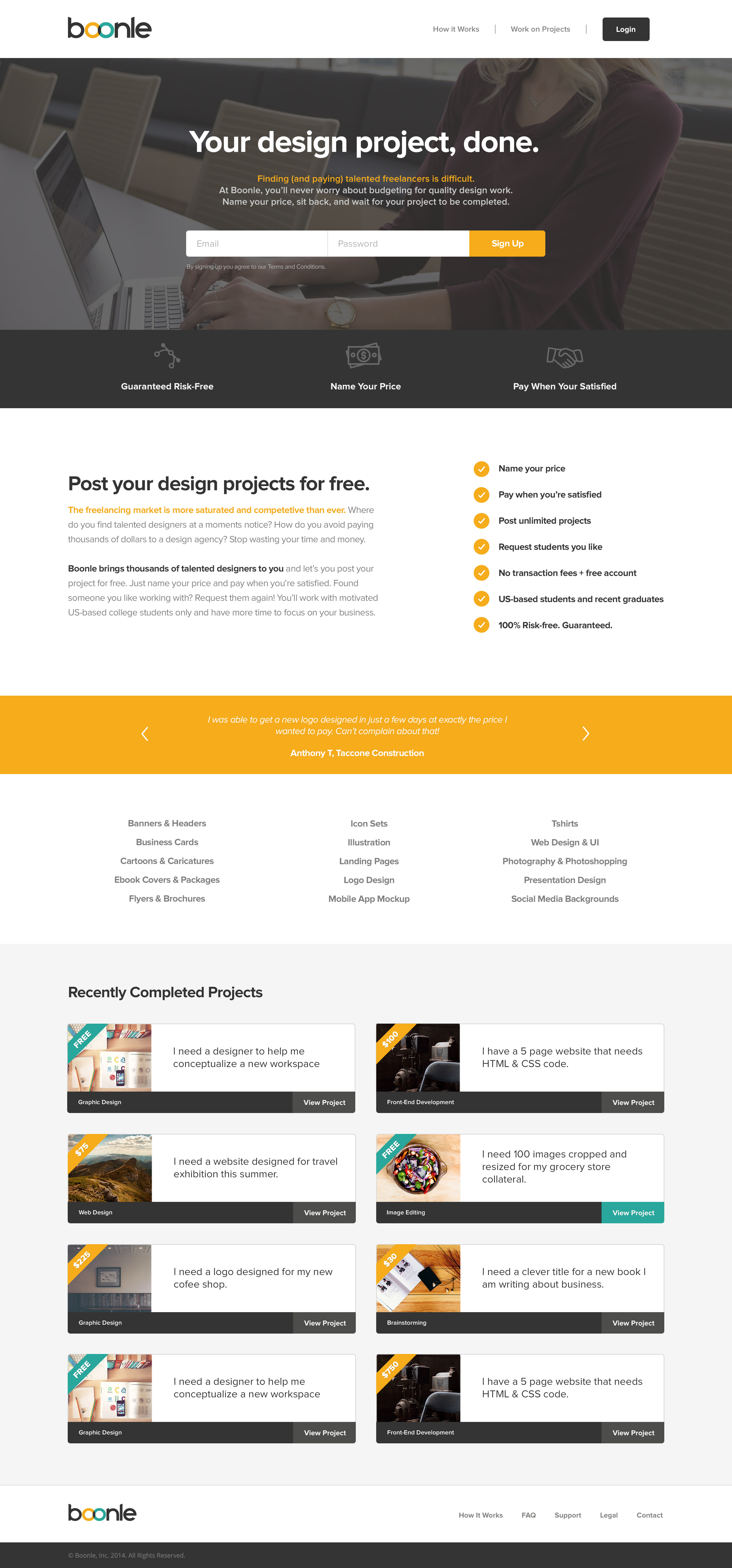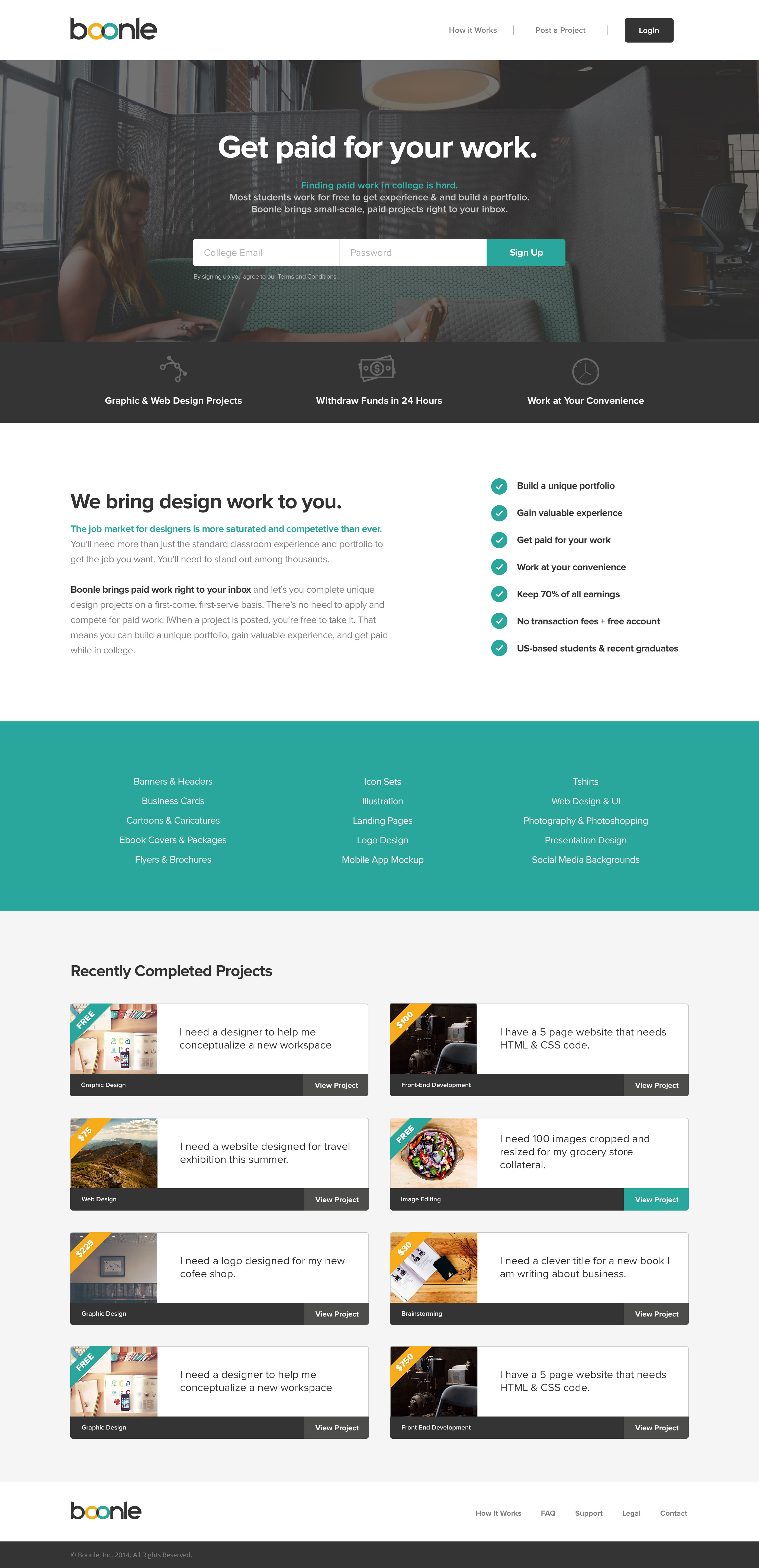 Boonle is a creative services marketplace that allows individuals, businesses, and non profit organizations to post their project needs with a price that they determine. Our pay-what-you-want model allows clients to get quality work done at a price they can afford by students who are eager to launch their career.
