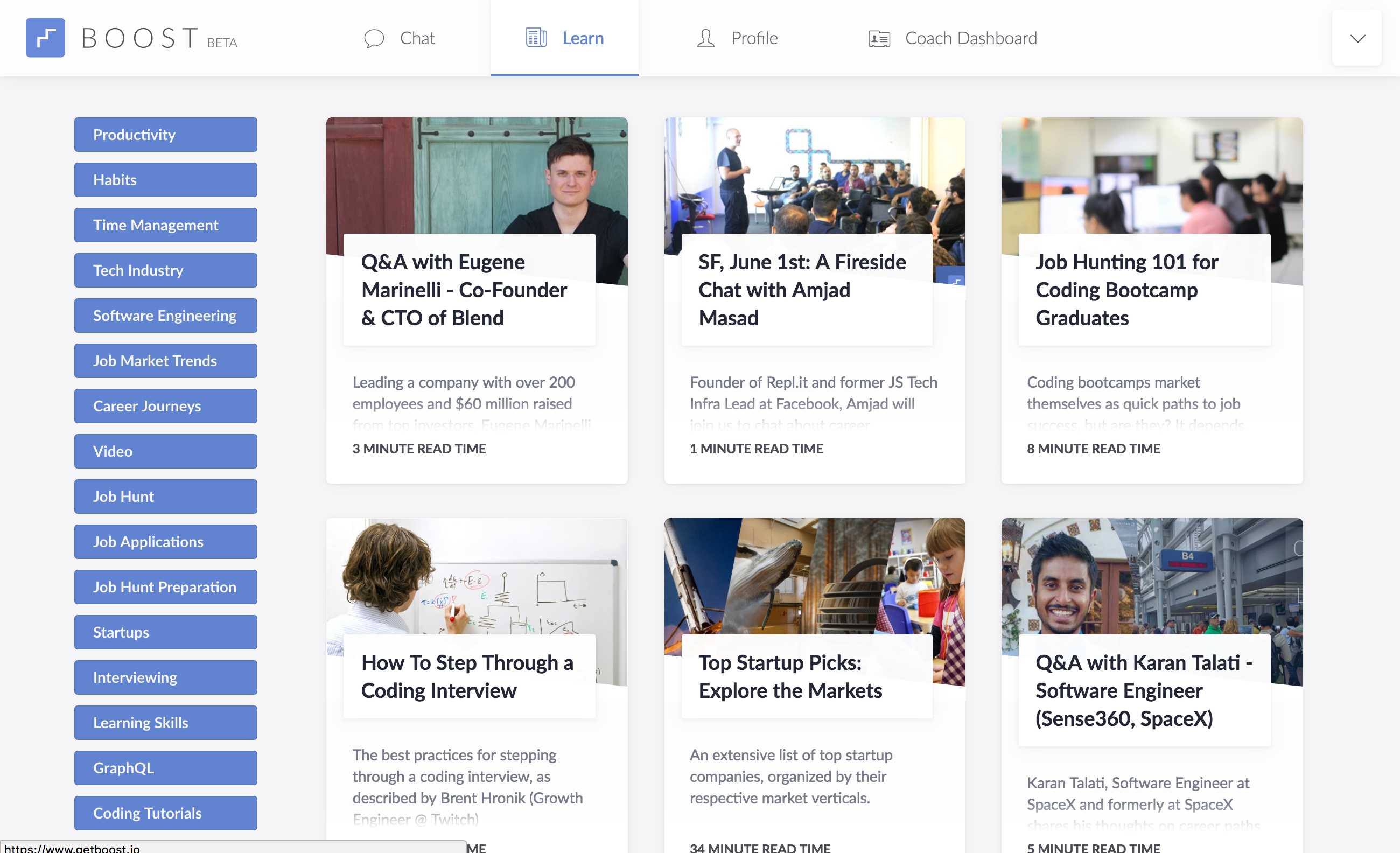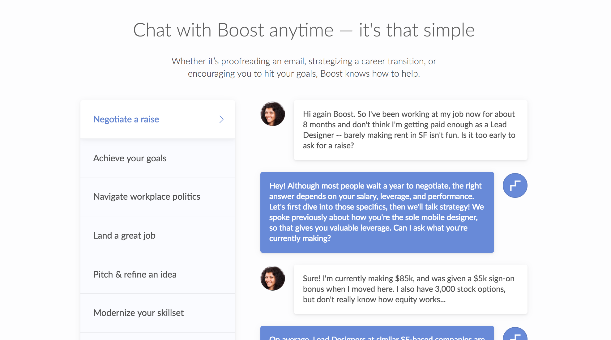 Boost is the #1 on-demand personal advisor & career coach. Simply chat with Boost about your goals or any situation/question and get the highest quality guidance, fast! Boost is available for those seeking to improve their career trajectories, whether it be succeeding at their current job or finding something new. It's always there to listen, provide unbiased feedback, help you plan ahead, and push you to achieve your goals. Powered by trained career coaches and proprietary tech, Boost is currently used by Google product managers, top open-source contributors, experienced designers, and college students alike. You can learn more and try Boost for FREE today by visiting https://getboost.io!