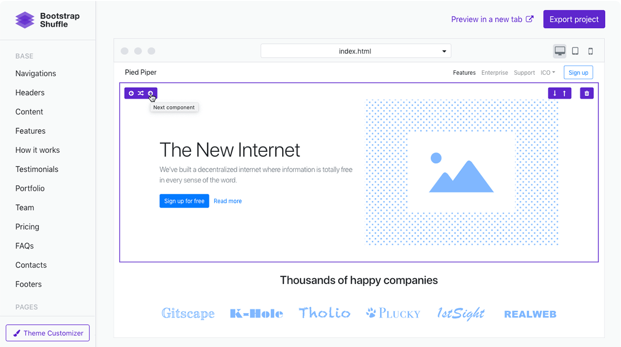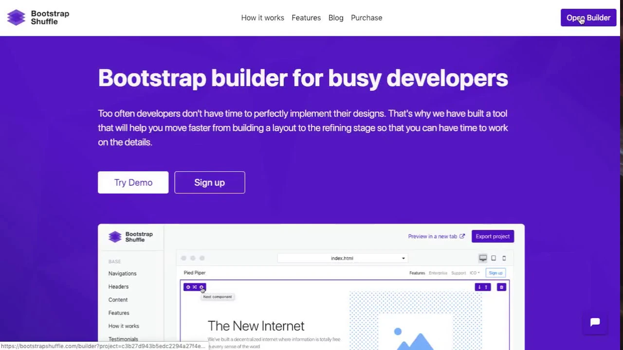 Too often developers don't have time to perfectly implement their designs! Therefore, what one has to do is as much automation as possible, elimination of repetitive activities, improvement of the processes in the known activities, as well as the as quick as possible proceeding with the difficult tasks which are usually left for the end of the project (interactions, elaboration of the details, back-end integration etc.). Bootstrap Shuffle is to help developers ship faultless projects on time, within a presumed budget and without stress. Work with Bootstrap Shuffle is about: 1. Creating a layout from the Bootstrap 4 components library. 2. Adjusting the styles (fonts, colors, margins etc.). 3. Exporting the project and further work on the details in your favorite IDE, eg. Visual Studio. This means that it maximally accelerates the initial stages of the project so that you have more time and can focus on perfecting the details.