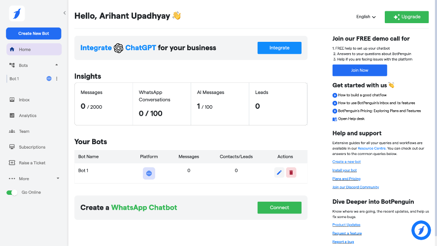 Presenting the quirkiest penguin from the chatbot maker’s family And drumroll 🥁 BotPenguin! BotPenguin makes sure that you keep up with your customers and visitors all the time with that awesome live chat, godly integrations and a mighty unified inbox to get all the queries. Get those super bots working on Telegram, WhatsApp, Facebook or your website and as we say, automation is the new gold! The chatbot gods have imbued this chatbot with conversational AI and we made sure this is easy to implement with zero dev time and zero setup cost.