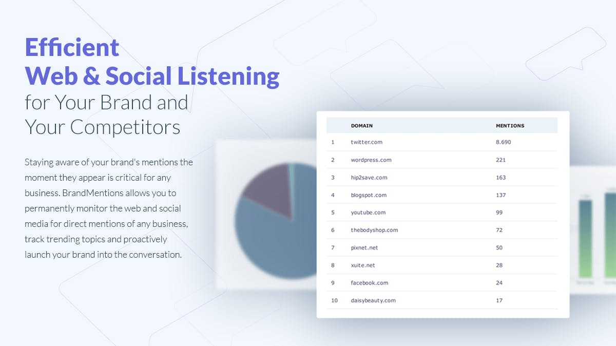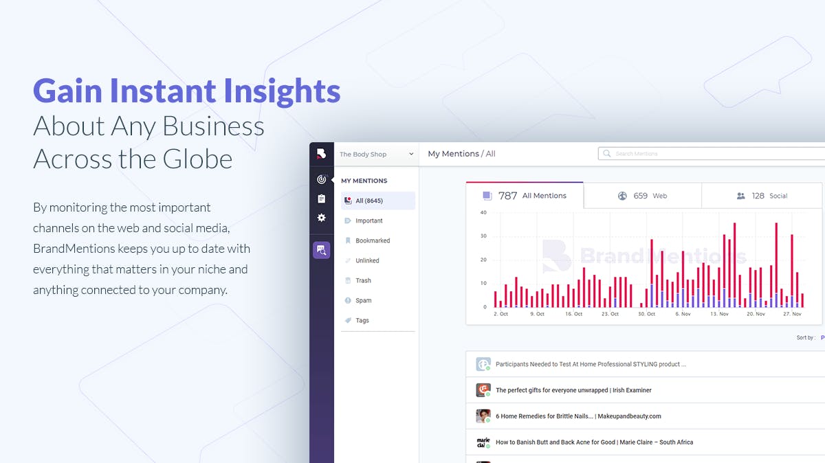 BrandMentions is a web and social media monitoring tool. It allows you to track and engage in online conversations in real time. Works great for spying on your competitors, managing your brand reputation, media & brand monitoring, content marketing and much more. A summary of this release and why we think BrandMentions is an innovative brand monitoring tool: - We provide near real-time, daily or weekly e-mail alerts for mentions that appear on the web and on social. - We monitor your website traffic (via a tracking pixel that you add on your site) and deliver instant new link notifications. - We provide a Quick Mention Research Tool that allows you to instantly view the mentions for any keyword that you type in, for the last 30 days. - We provide smart filtering and detection for brands that use common words (Orange, Majestic, etc). - We provide in-depth filters and analytics. - Plus all the juicy stuff like: reports, sentiment analysis and historical mention recording and more.