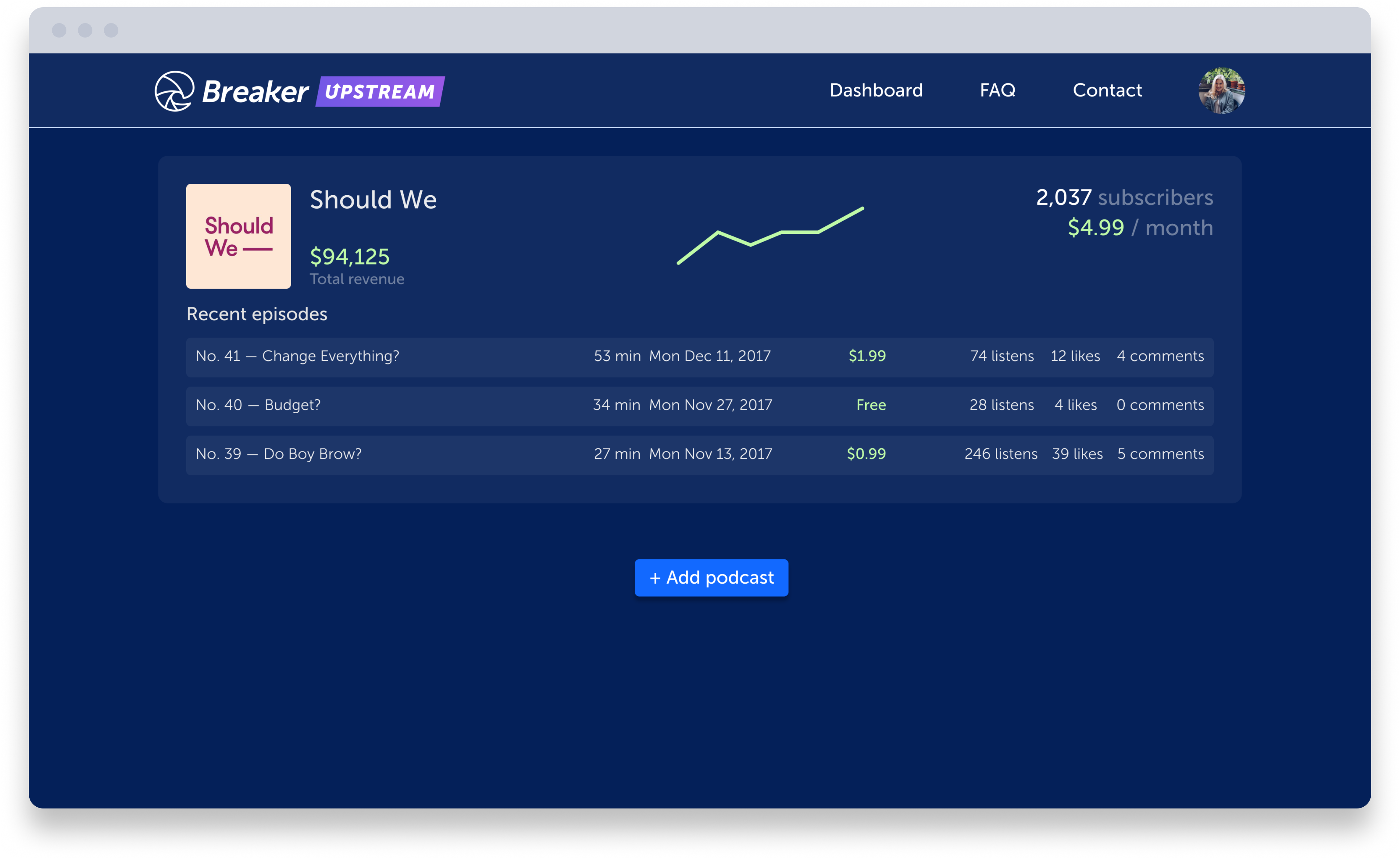 -Simple setup -You own your content -Secure audio hosting -Advanced listener data -Credit card processing -Customer support