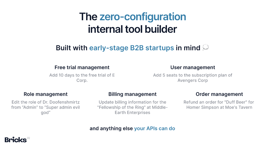 Bricks AI redefines internal tool creation, allowing you to transform your internal APIs into a ChatGPT-like interface for your team — with zero configuration. With Bricks AI, you can simply: ⬆️ Upload your #OpenAPI / #Swagger specifications ✅ Select which endpoints to make available 👥 Define who can access each endpoint ...and you’re good to go.