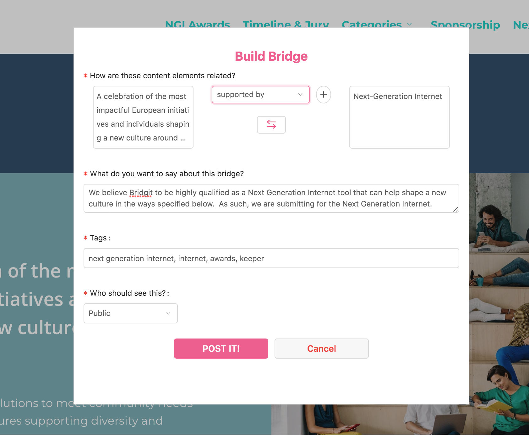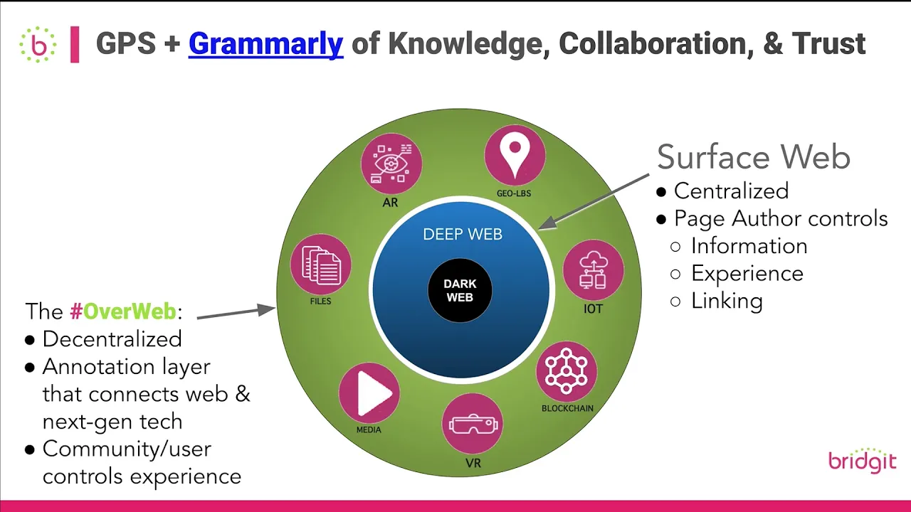 A Social Knowledge Ecosystem comprised of “decentralized” social networks, network services, and applications = The Minecraft of Knowledge + The Grammarly of Trust + The GPS of Info. Bridgit is building the #Overweb, a Trust Layer that displays on top of the web, where you own and control your data and earn value you create. Bridgit recently won the 2019 Disruptive Technology Culture Driver award from the EU's flagship Next Generation Internet program. Bridgit operates as an “always-available, wherever you are” browser overlay. In alignment the annotation capability recently adopted as a standard by the W3C, Bridgit democratizes linking so that users can create bridges on any page that connect information on an idea by idea basis with semantic relationships (e.g., supporting, conflicting). Collectively, the bridges constitute an "Internet of Ideas” - a much higher signal-to-noise and more connected network than Today’s Internet of knowledge silos. Bridgit will enable one to find trustworthy information quickly and see the 360 degree context of any idea on the web.