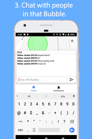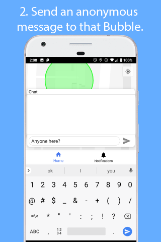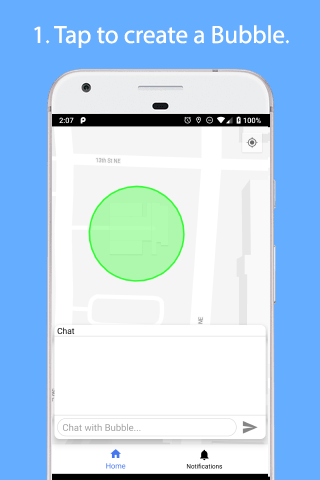 Bubble is an anonymous mobile social app which allows you to chat with anyone else using the app in a circle (Bubble) you create by tapping on a map. For example, you could make a bubble at your dorm and say "does anyone want to get lunch" and make a friend using the app.