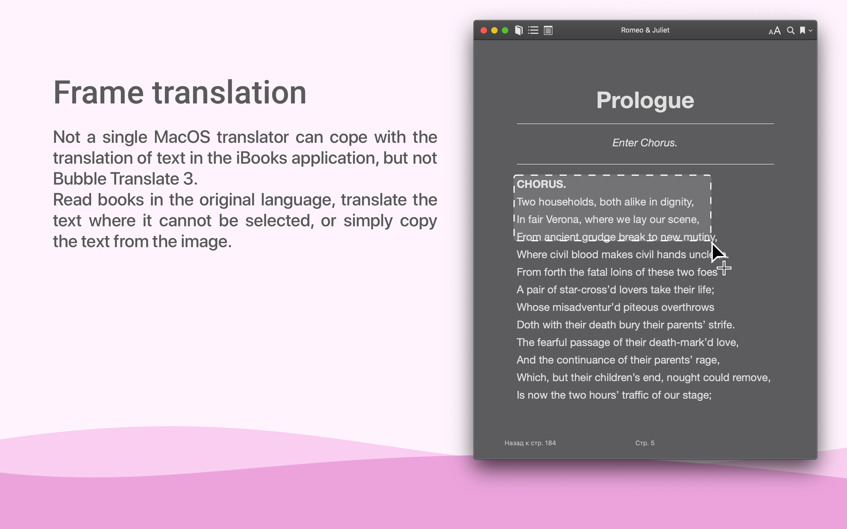 We made the translator the way you wanted it to be. We took all the best from Bubble Translate, improved the design and added the features that you were waiting for. Frame Translate. Not a single MacOS translator can cope with the translation of text in the iBooks application, but not Bubble Translate 3. Read books in the original language, translate the text where it cannot be selected, or simply copy the text from the image.
