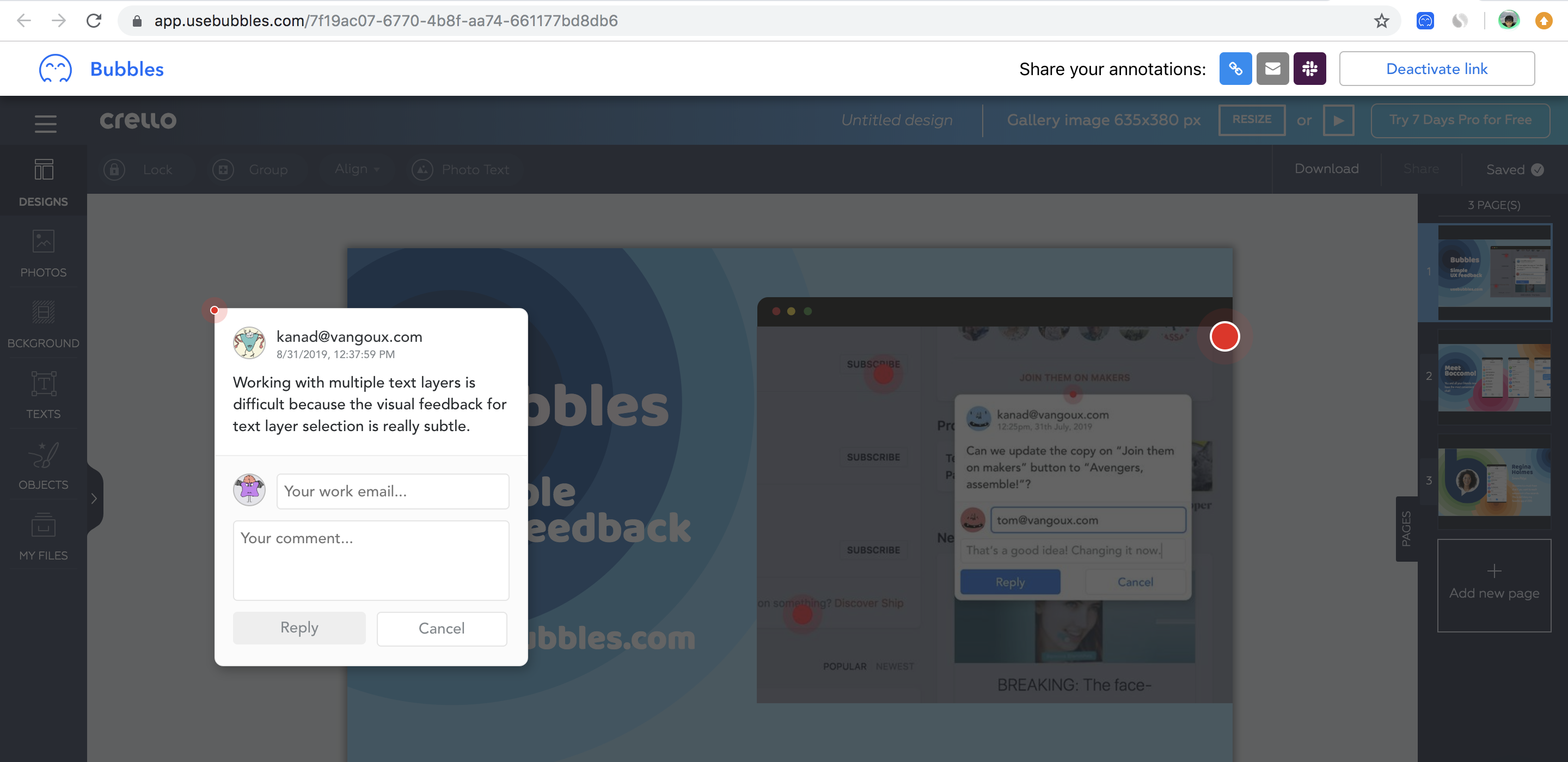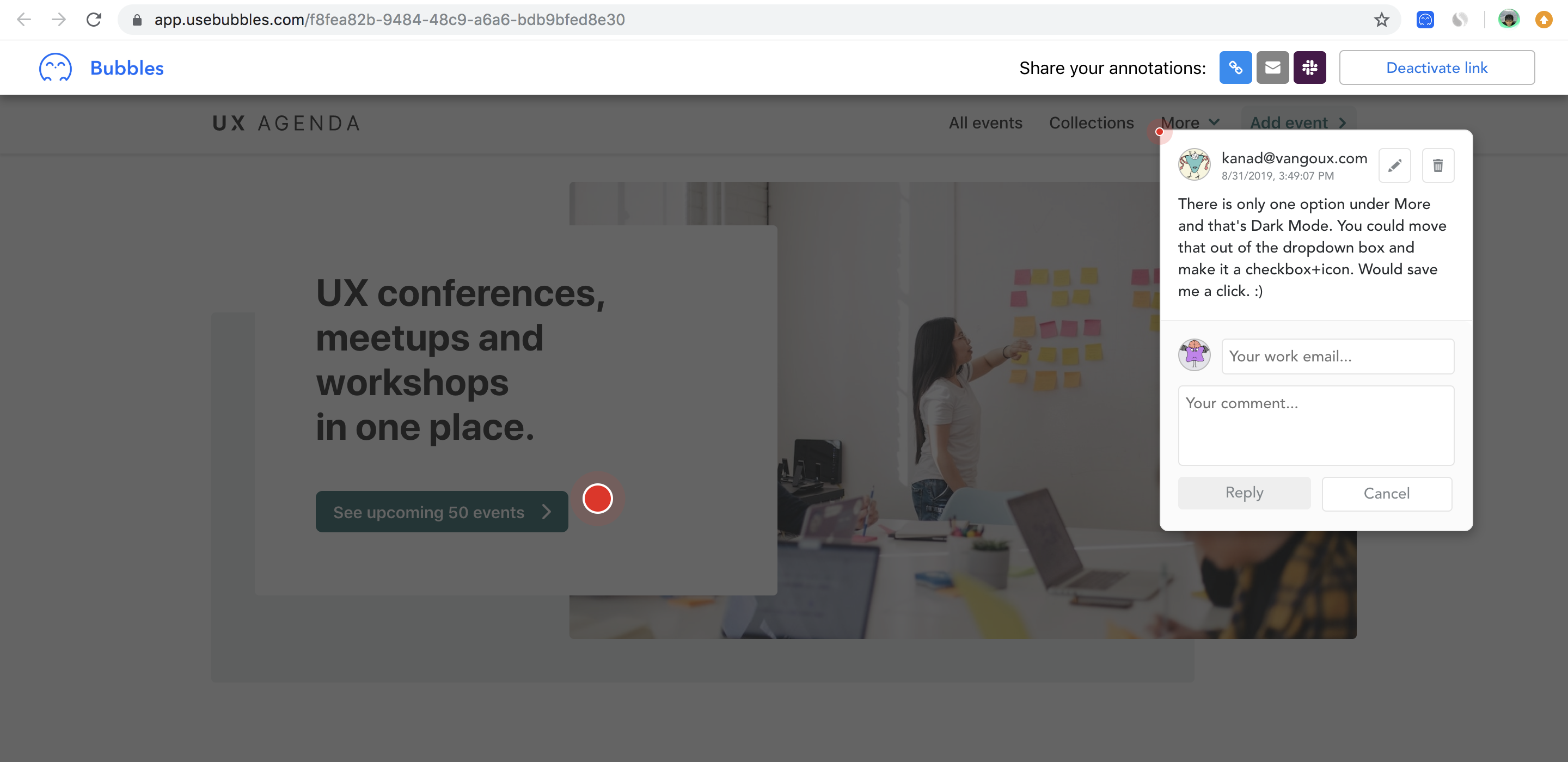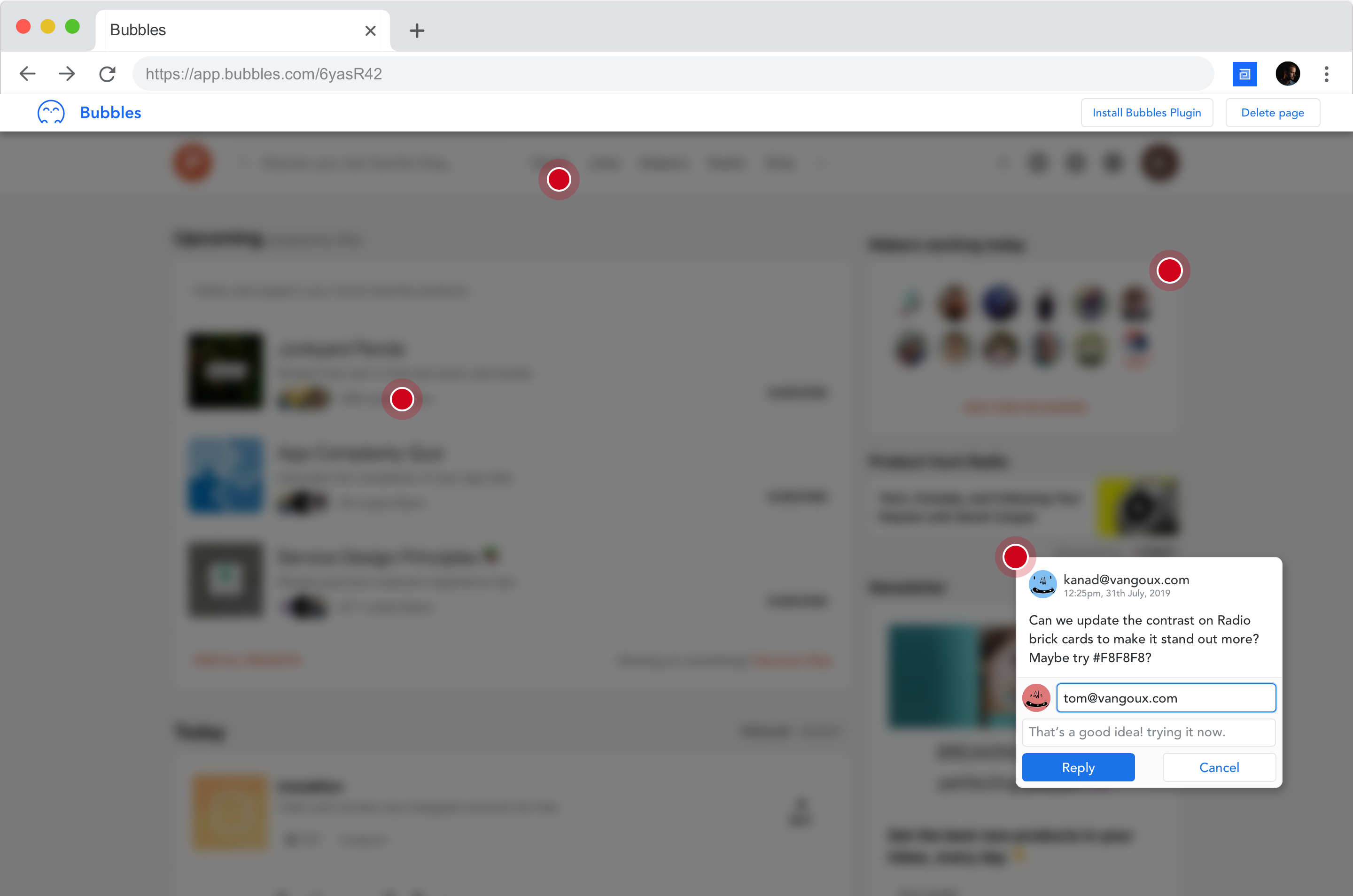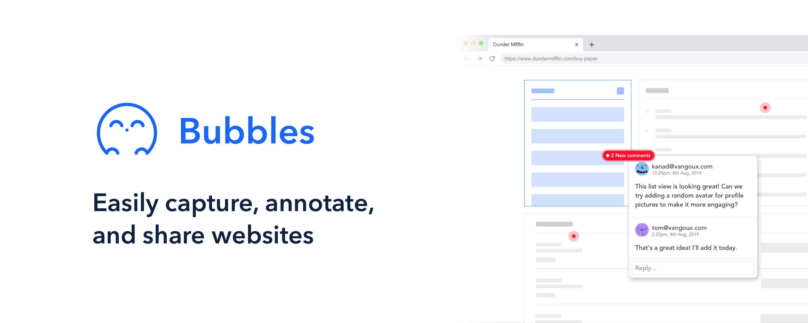 Bubbles - Drop comment bubbles anywhere on the screen, on any website. Bubbles is a Chrome extension for UX and web designers. It allows you to drop comments anywhere you click on a webpage. You also get a unique link to share those comments with your teammates. Your teammates can reply and resolve those comments in real-time.