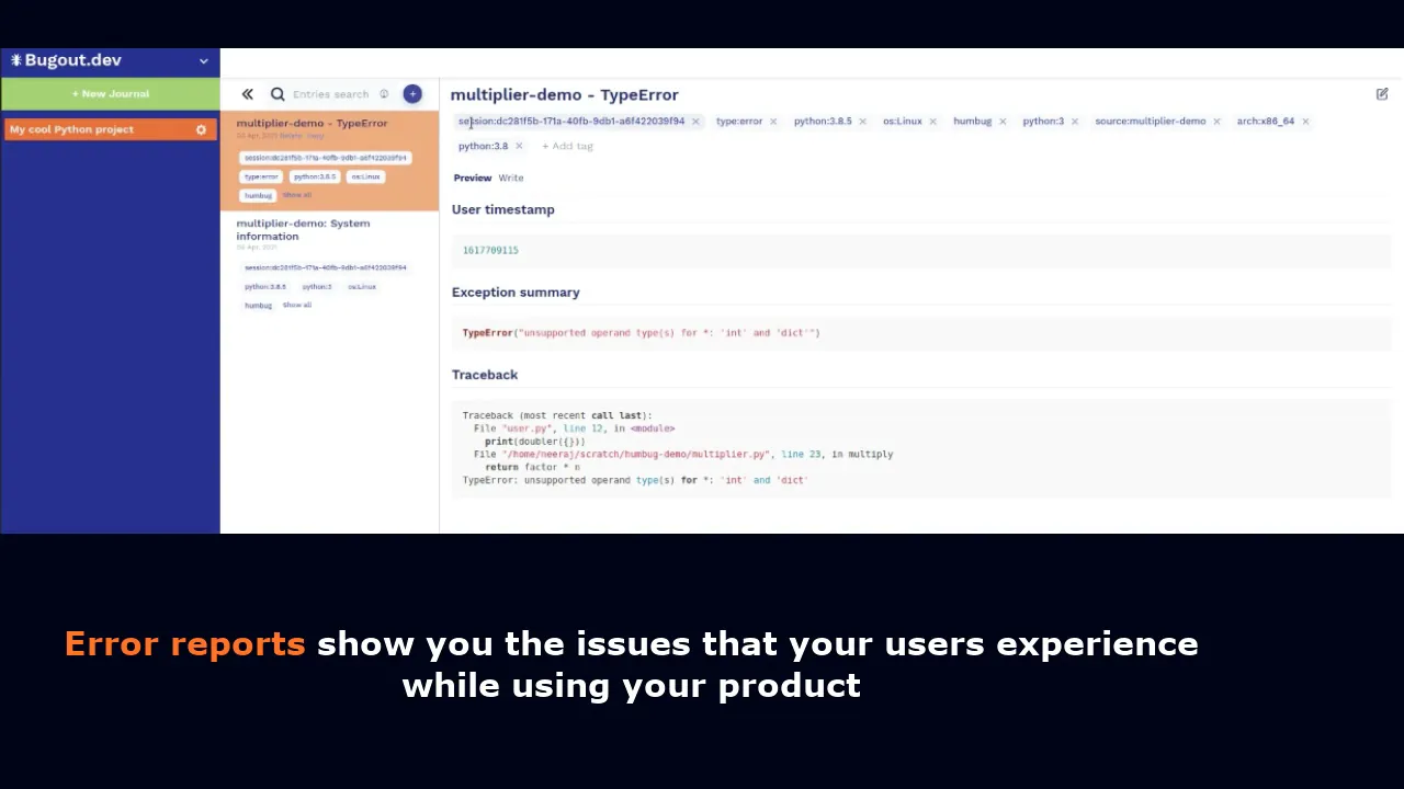 Bugout helps maintainers of APIs, command line tools, and libraries better understand their users: with usage metrics and crash reports. We are advocates of ethical data collection and bringing the value back to the end user. That’s why all actions are happening with clear user consent. And when error fixes are available, users are directed to fixes via error messages.