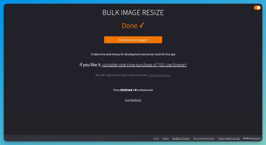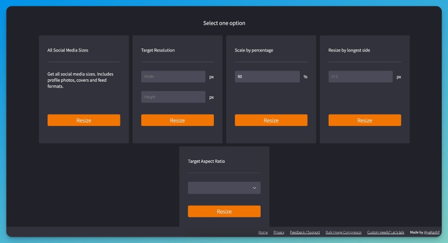 Bulk image resize lets you resize images and photos in batch. Resize to target aspect ratio, resolution or resize by percentage. Your images stay on your machine. Smart resize is context-aware and tries to keep subject matter in focus. Works on jpg/png. Blazing fast. No uploads. No signup. Privacy friendly.