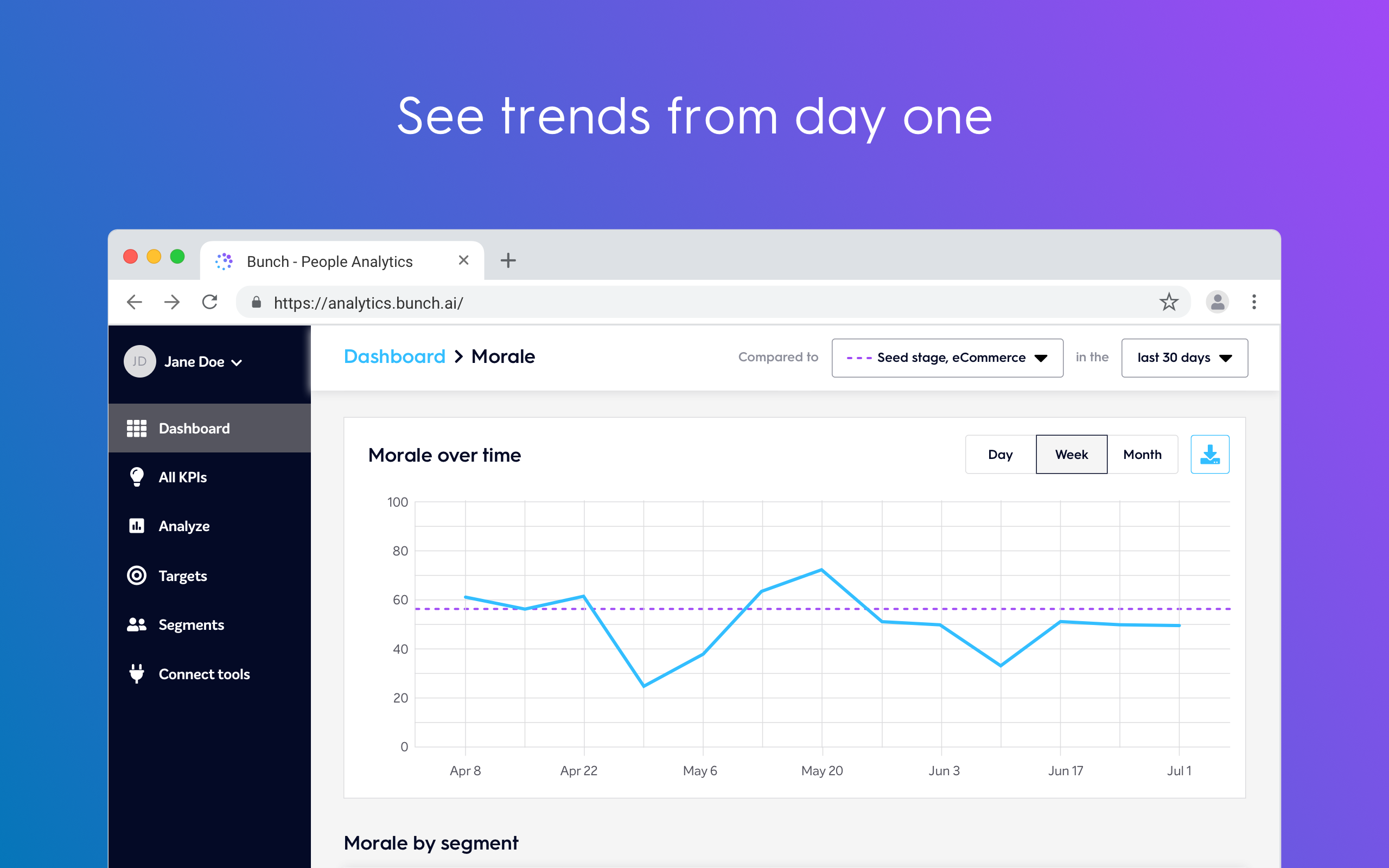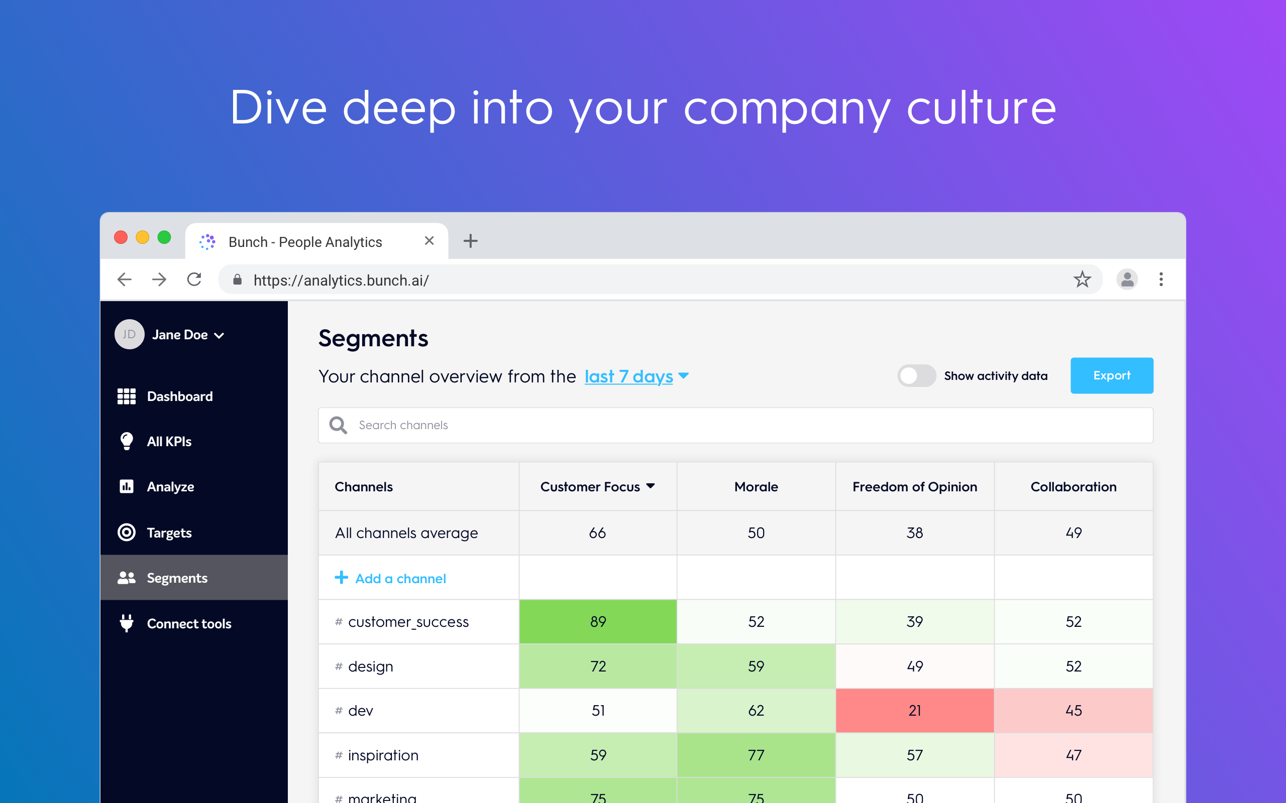 Bunch.ai is a powerful AI that analyzes the language your team uses on Slack to calculate KPIs for morale, collaboration, freedom of opinion, and more. It does this by mapping words and phrases to cultural characteristics, and incorporates the latest research in organizational behavior and psychology from Stanford, Harvard, and MIT. Bunch connects to your company’s Slack account in order to give you key insights into how your team works. However, we only process a small subset of the data you give to Slack. The analytics you see on your Bunch dashboard are based on the vocabulary used by your team and their Slack usage patterns in public channels only. We do not process direct messages between employees, private conversations or customer communications. It’s also worth noting that when Bunch analyzes Slack activity, all data is immediately anonymized. No human ever sees your data; and it's automatically discarded immediately after being processed by our AI. This allows us to provide analytics on an aggregate level, while protecting the privacy of individuals.