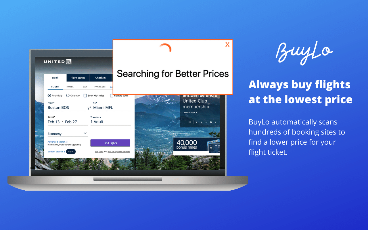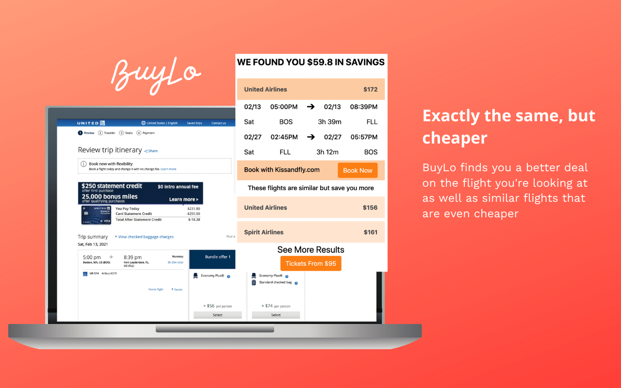 BuyLo is a Firefox & Chrome extension that automatically finds you a better price on a flight you're about to book. It's like Honey, but for flights!