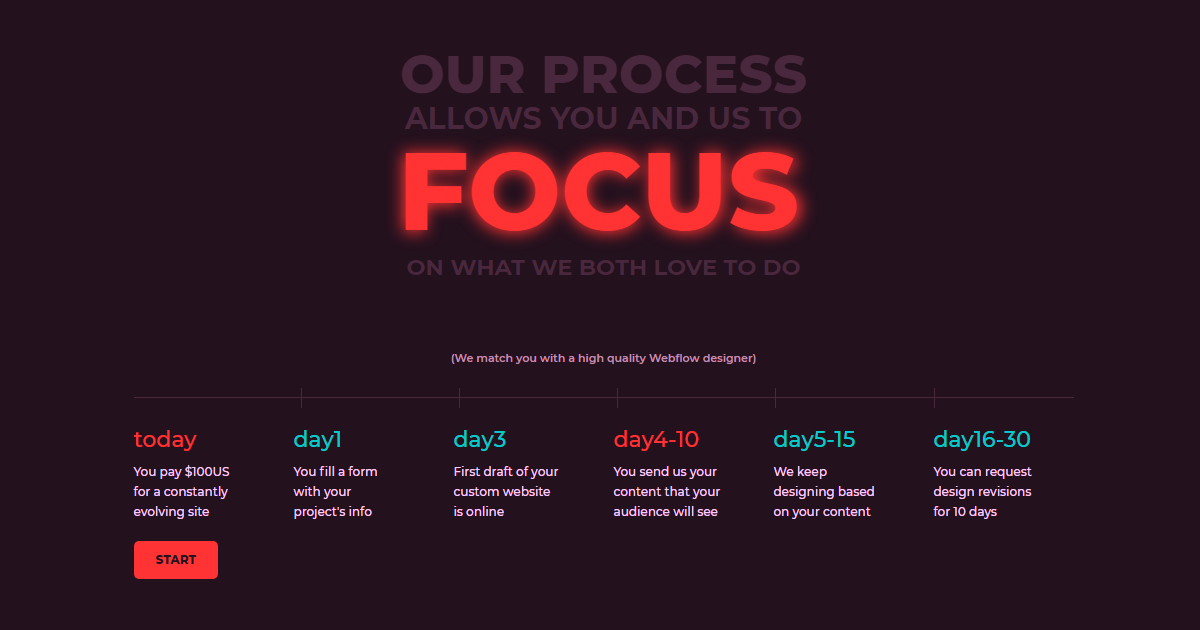 For a monthly subscription our platform provides you with selected webflow designers that will build your custom website and upgrade its design and functionality at different stages of your brand. ‍ In 3 days you'll have the first section of your custom website working online and then we'll continue upgrading it with more functionality and pages month by month according to how your audience responds, so your site keeps evolving and monetizing through your monthly subscription.