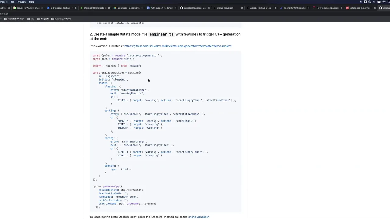 This package allows to convert TypeScript language State Machine developed using Xstate into C++ generated SM, no coding required. Project location: https://github.com/shuvalov-mdb/xstate-cpp-generator NPM TypeScript package location: https://www.npmjs.com/package/xstate-cpp-generator Copyright Andrew Shuvalov, MIT License