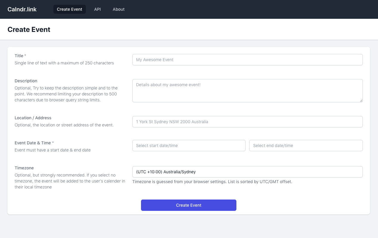 Simple, easy and free add to calendar links for your website, email newsletter, profile or anywhere else! No tracking, no ads, no signup ?. I built calndr.link after I had multiple clients request the exact same thing - a simple and easy way to generate calendar links, for adding to their website or in email newsletters. There's a few existing providers out there, but they're extremely pricey for what they do - take some basic data (title/date/etc) and reformat it into a url for a calendar provider (be it google or apple). Calndr is 100% free, and we don't log anything, nor require your details. Just use the GUI to build an event, or generate links directly though the API. We run on Google Cloud Serverless infrastructure, so the service is rock solid and fast. Check it out, have a play and feel free to hit me with any feedback you have :)