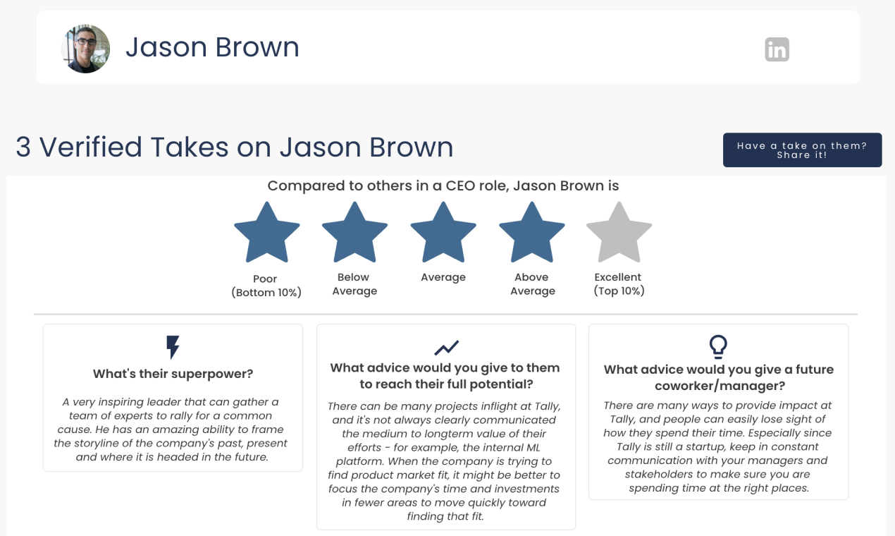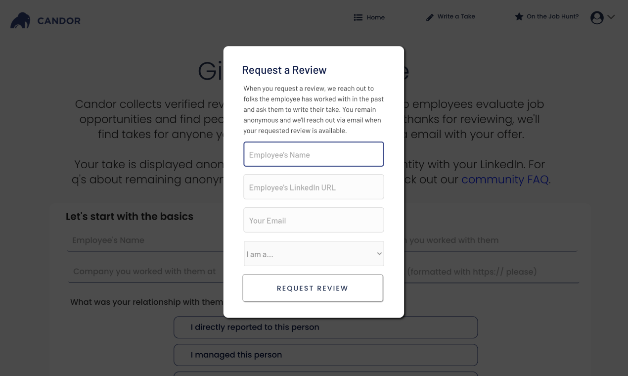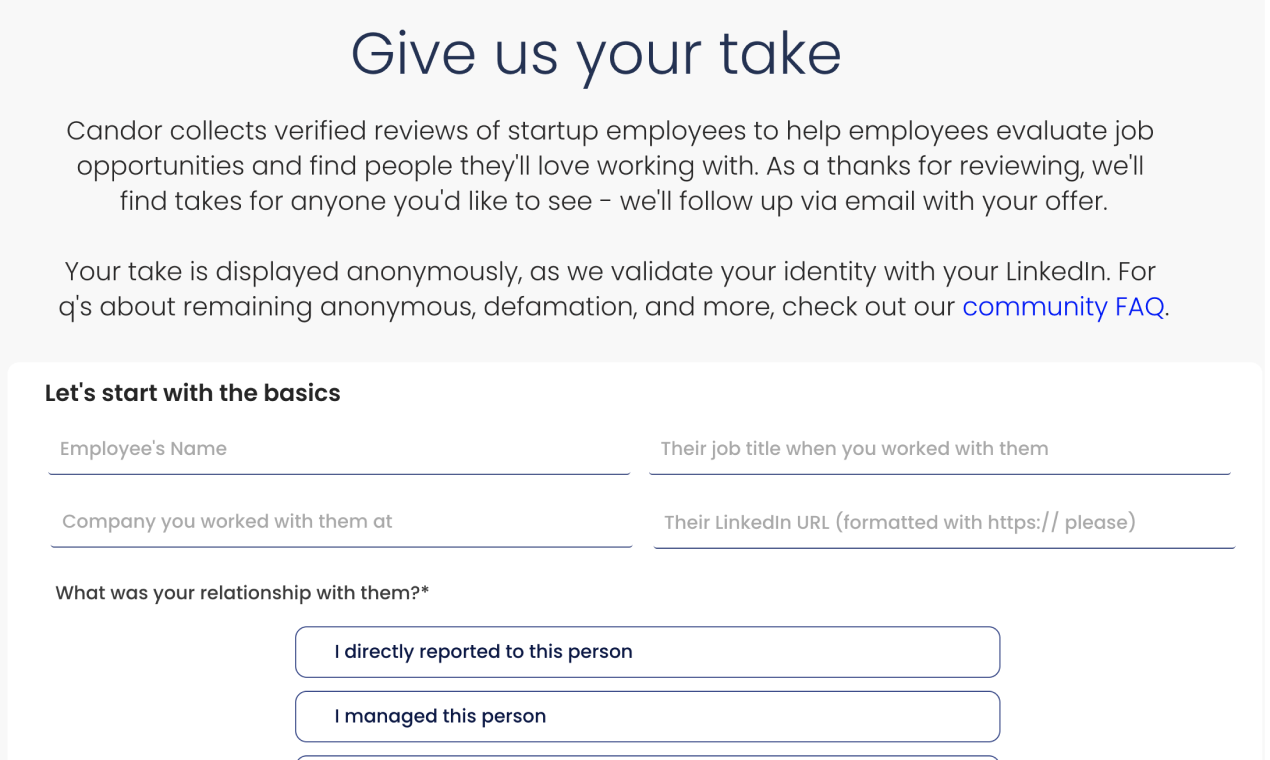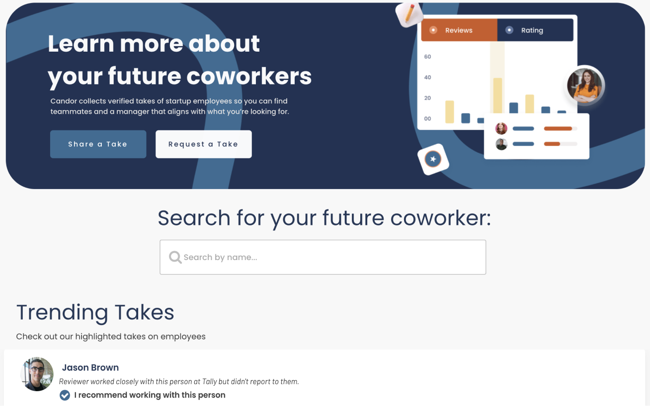 Very excited to be launching today and sharing Candor, a product we've been building the last few months. We created Candor to help top talent evaluate new startup opportunities by providing real feedback on future leaders, managers, and peers at hiring companies. How can you confidently decide to work with people you only met once in an interview setting? How do you know their authentic work style? Your success and well-being at work is deeply intertwined with who you work with, yet there isn’t a good way to assess your compatibility with potential co-workers. Until now. Enter Candor. After chatting with hundreds of startup employees we realized that most people in fact perform due diligence but behind the scenes, on private phone calls and in hush-hush meetings. Backchannel references are the norm. If you have a strong network you’re in better shape, but even then, in many cases you’ll get only one or two opinions if you’re lucky. Given the current state of affairs, every time you start at a new company there’s a high risk you’ll join a team that's a poor fit. Candor’s objective is to make transparency and accountability the norm when it comes to deciding who to work with. Transparency shouldn't be limited by our networks, and it shouldn't be exclusive to private calls with first and second degree connections. Learning more about who you might be working with isn’t just a nice-to-have, it's a critical piece of the puzzle. We're in our early days at Candor, but we'd love your take on current and former co-workers. Check us out at withcandor.co, browse reviews, and share your take on a teammate, manager, or leader that you've worked with. Thanks for reading - excited to hear your feedback and questions!