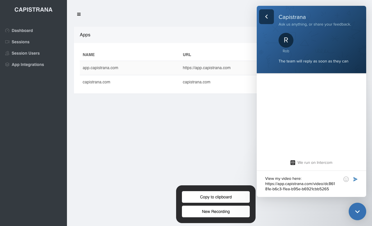 When trying to support a user that is struggling, understanding the problem can often be time-consuming. If the issue is of a technical nature, the user might not be able to explain it at all. Sometimes, you might even end up spending more time trying to get your head around the problem than you did fixing it. What if you could spend all that extra time helping other customers, or developing new features? Capistrana allows your users to record their screen in the browser and show you precisely what their issues are. With no additional set up needed, we seamlessly integrate with Intercom. Capistrana could revolutionize the way you approach customer support - and for a limited time, Capistrana is completely free to use.