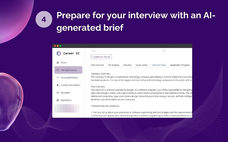 Introducing Career AI: Your personal AI assistant for career growth. Career AI is a web application and browser extension designed to streamline and optimize your job application process. Career AI helps you save jobs of interest as you browse the web and easily customize your resume and cover letter to match the job description. Career AI also provides a comprehensive application tracking system. Keep tabs on all your job applications in one place, effortlessly organizing and managing them with ease. Our smart dashboard displays key details like application status, interview dates, and more, helping you stay on top of every step in the hiring process. Key Features: 1. Intelligent Fit Assessment: Say goodbye to endless scrolling through job boards. Career AI employs intelligent algorithms to analyze job postings to help you identify the most relevant job opportunities based on your qualifications and career goals. 2. Tailored Application Materials: Career AI uses natural language processing and machine learning techniques to generate customized cover letters and resumes based on your unique profile. Simply input your information, and Career AI will create professional-quality application materials that highlight your strengths and align with the job requirements. 3. Application Tracking: Keeping track of your job applications can be a daunting task. Career AI simplifies the process by providing a centralized dashboard where you can manage and track the status of all your applications. Receive real-time updates on application progress, interview invitations, and more. 4. Interview Practice [coming soon]: Receive personalized recommendations from our AI assistant. Get tips on improving your application materials, interview techniques, and overall job search strategy. Career AI is your dedicated virtual assistant, working tirelessly to optimize your job application process and increase your chances of success. Say goodbye to the stress and uncertainty of job hunting – let Career AI empower you to take control of your career and land the job you deserve.