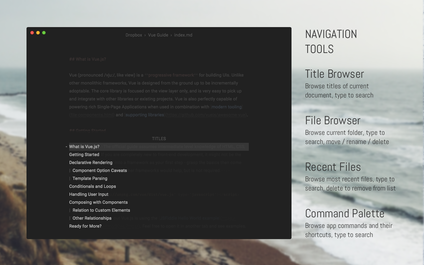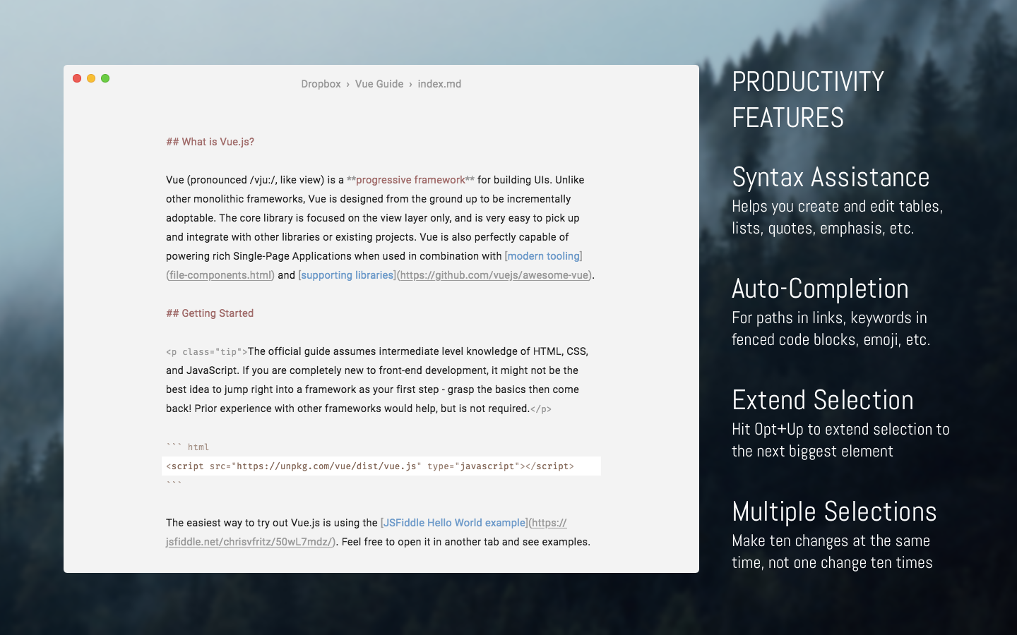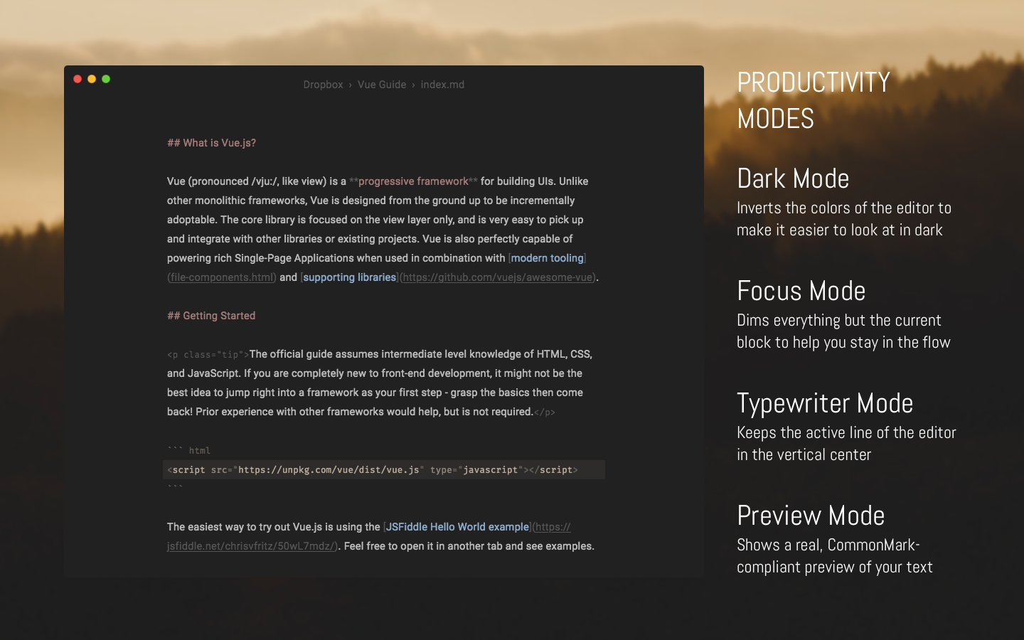 Caret is a Markdown editor that combines the aesthetics of prose editors with the productivity features of code editors - features like syntax assistance, multiple cursors, file manager, etc. It's based on a Markdown algorithm that the team wrote a while back and open-sourced at https://github.com/erusev/parsedown. We've been working on Caret full-time for almost 2 years. We released version 1.0 about a year ago and today we're excited to show you version 2.0.