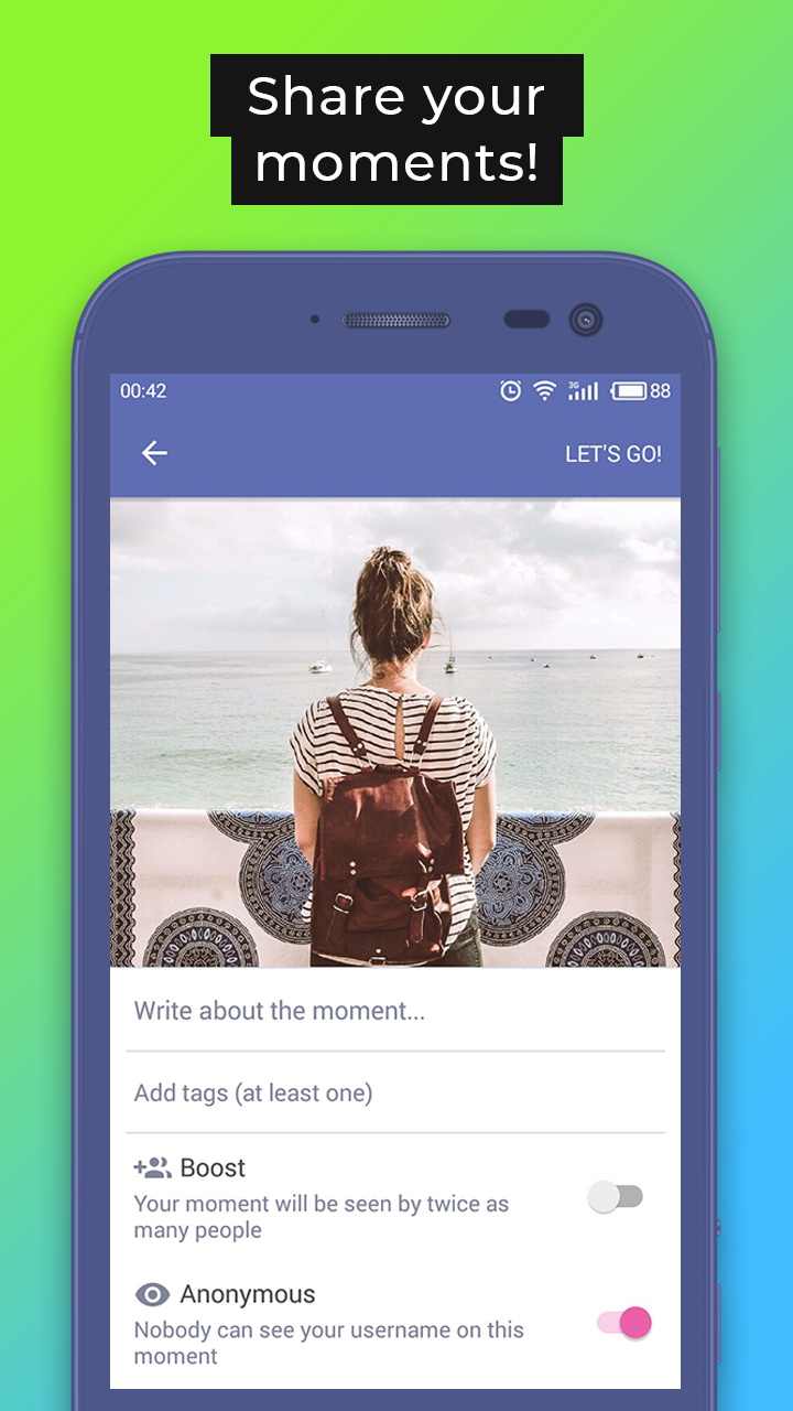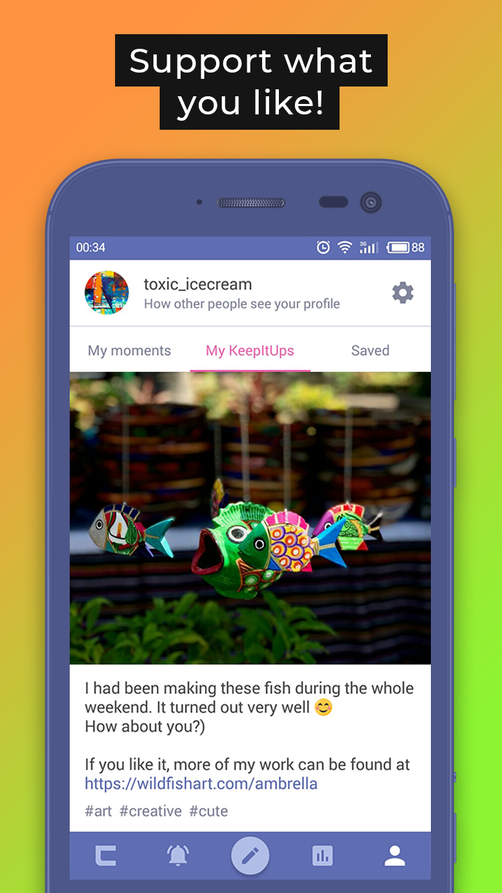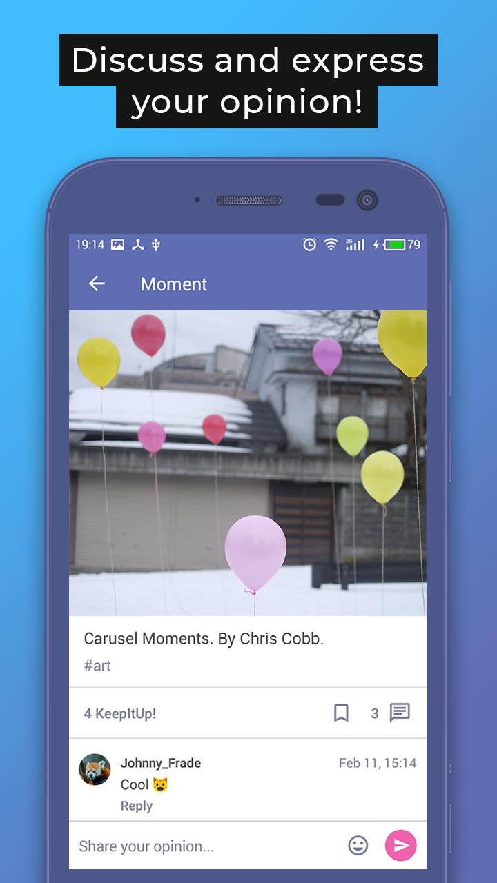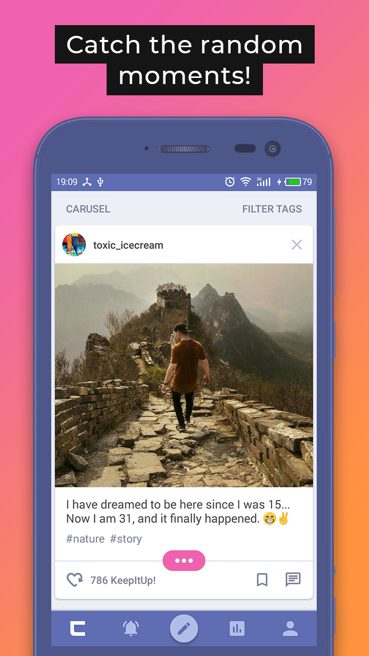 Today we are all spinning in a continuous whirlwind of information, where public opinion is increasingly influencing our lives, taking away our freedom of expression... Are you ready to go beyond the traditional social networks that impose content on you and discover the world of new opportunities? Imagine a place where the rating of publications is determined only by unbiased people, and where everyone has an equal opportunity to be heard! * * * Carusel is a new milestone in the development of social networks, where the moments you publish are not distributed by complicated algorithms, but by sharing them with random people across the world, and not limited by your subscribers! How Carusel works: 1. A user publishes a moment that is sent to a group of random, unbiased people. 2. If they like your moment, they can support it by tapping on KeepItUp! 3. The moment that was supported is spreading to another group of people and so on. As a result, users will receive highly-rated moments, but also fresh publications. This principle allows readers to enjoy cool content, and authors can get the recognition they deserve! Features: - Public your moments. Just choose a photo and share your thought. - Receive REAL feedback. Carusel is a community that independently and impartially determines the awesomeness of the content. - Search for new interests and friends, not locked in a circle of your subscriptions. - Equal opportunity to share information, artworks or anything else, and get deserved recognition. - Freedom of self-expression that allows you to impact culture. - Expand your audience and find new fans. - And many more in the future versions! * * * Publish your genuine emotions, share your thoughts and inspire others :) The world is changing, taste it first! Catch the moment in Carusel!
