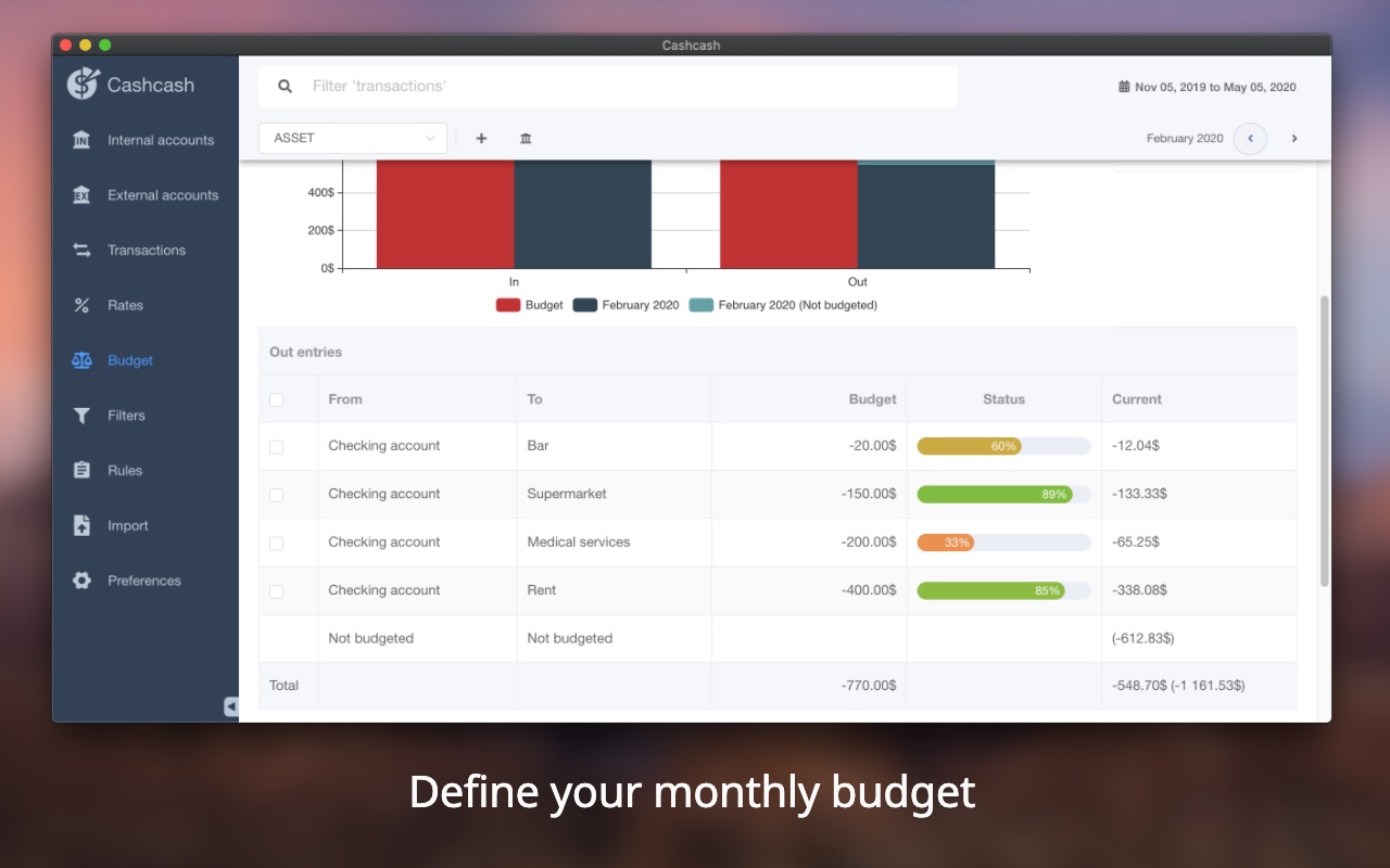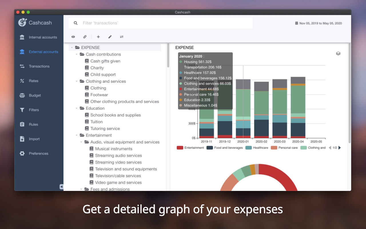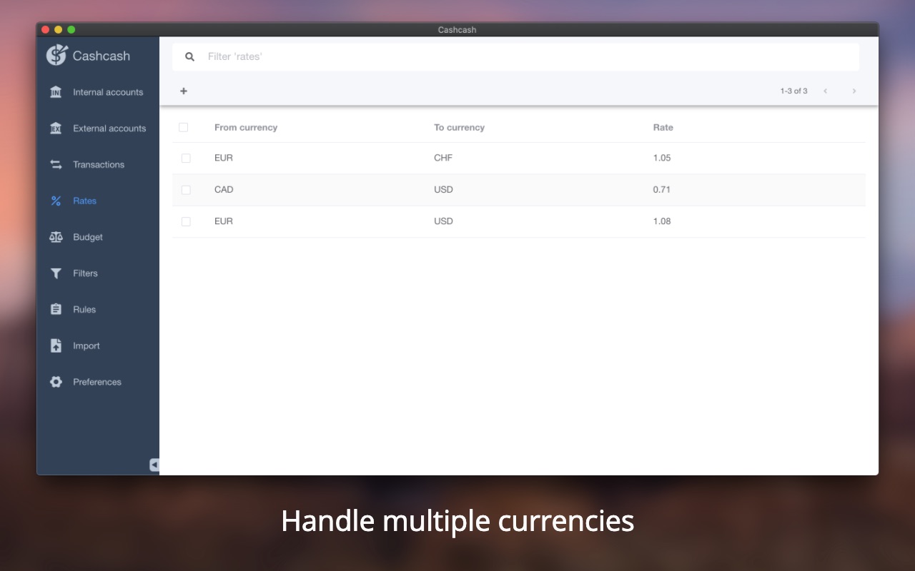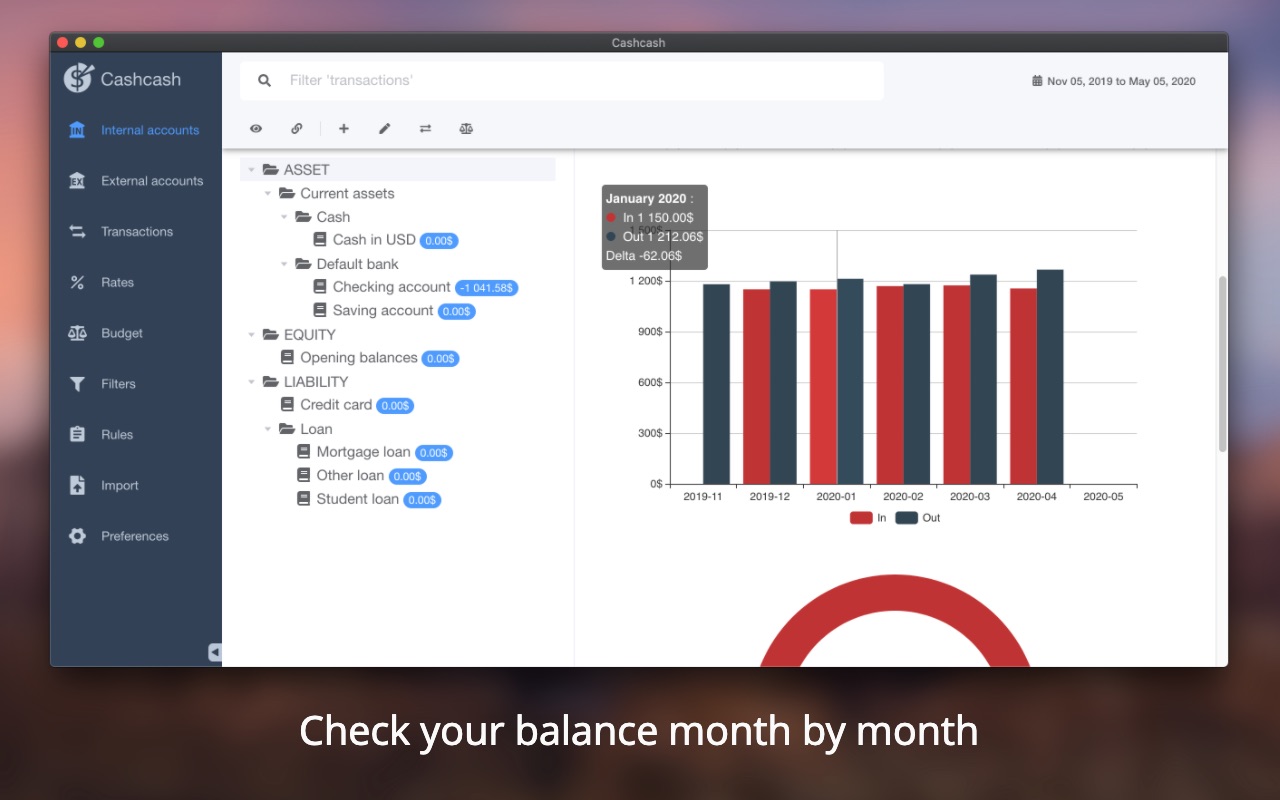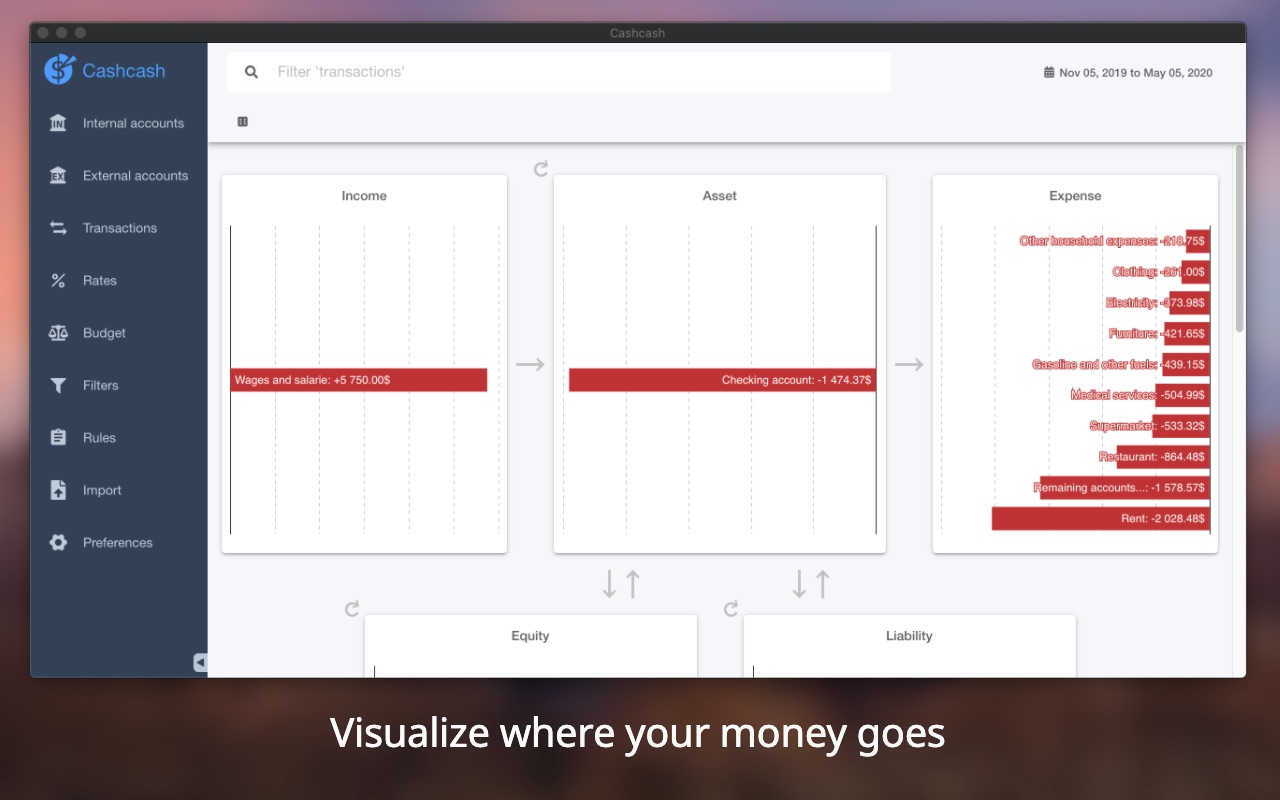 When Kibana meets GnuCash. The goal of Cashcash is to let you visualize your cash flow through graphs and straightforward UI without oversimplifying the complexity of finance. It's a desktop app available on Mac and Windows.