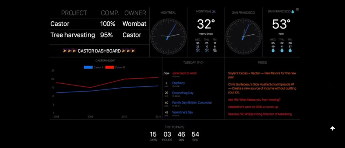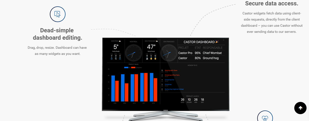 Castor is a powerful yet simple web app giving you all the tools you need to nicely display your data. It Creates monitoring dashboards and presents your data with a gorgeous interface, on any screen, from an iPad to a wall-mounted TV. Features: Dead-simple dashboard editing: Drag, drop, resize the dashboard can have as many widgets as you want. Secure data access: Castor widgets fetch data using client-side requests, directly from the client dashboard – you can use Castor without ever sending data to our servers. Webhooks: Each widget can be instantly updated using webhooks, just get the Webhook URL for a specified widget and send some data! Live refresh: No need to refresh — edit your dashboard on your Mac to see it live on your iPad or TV screen.