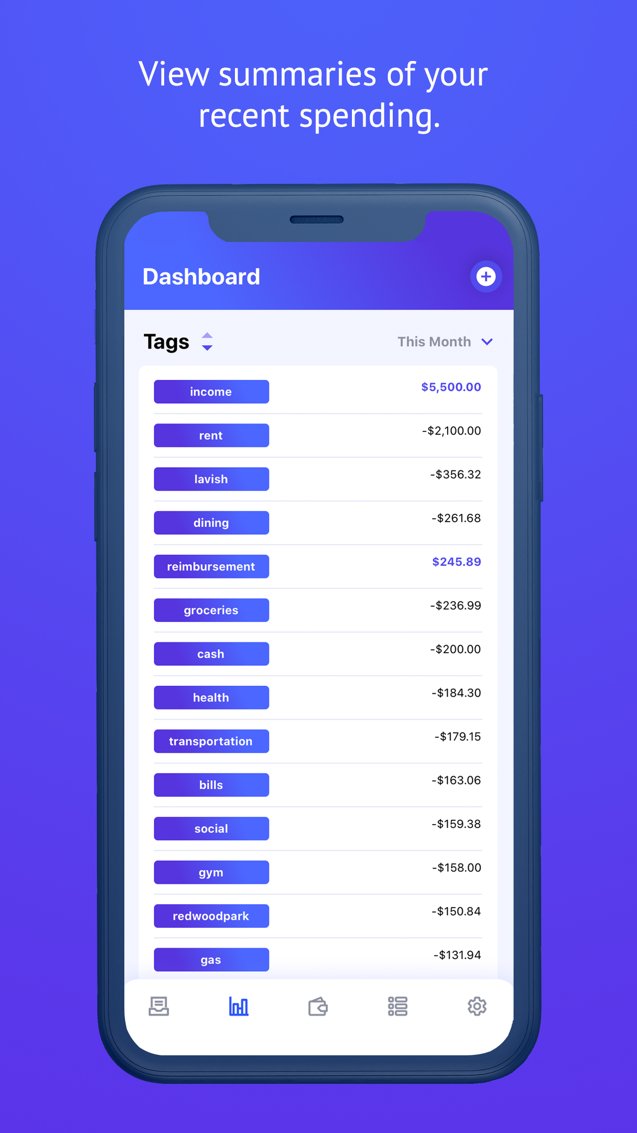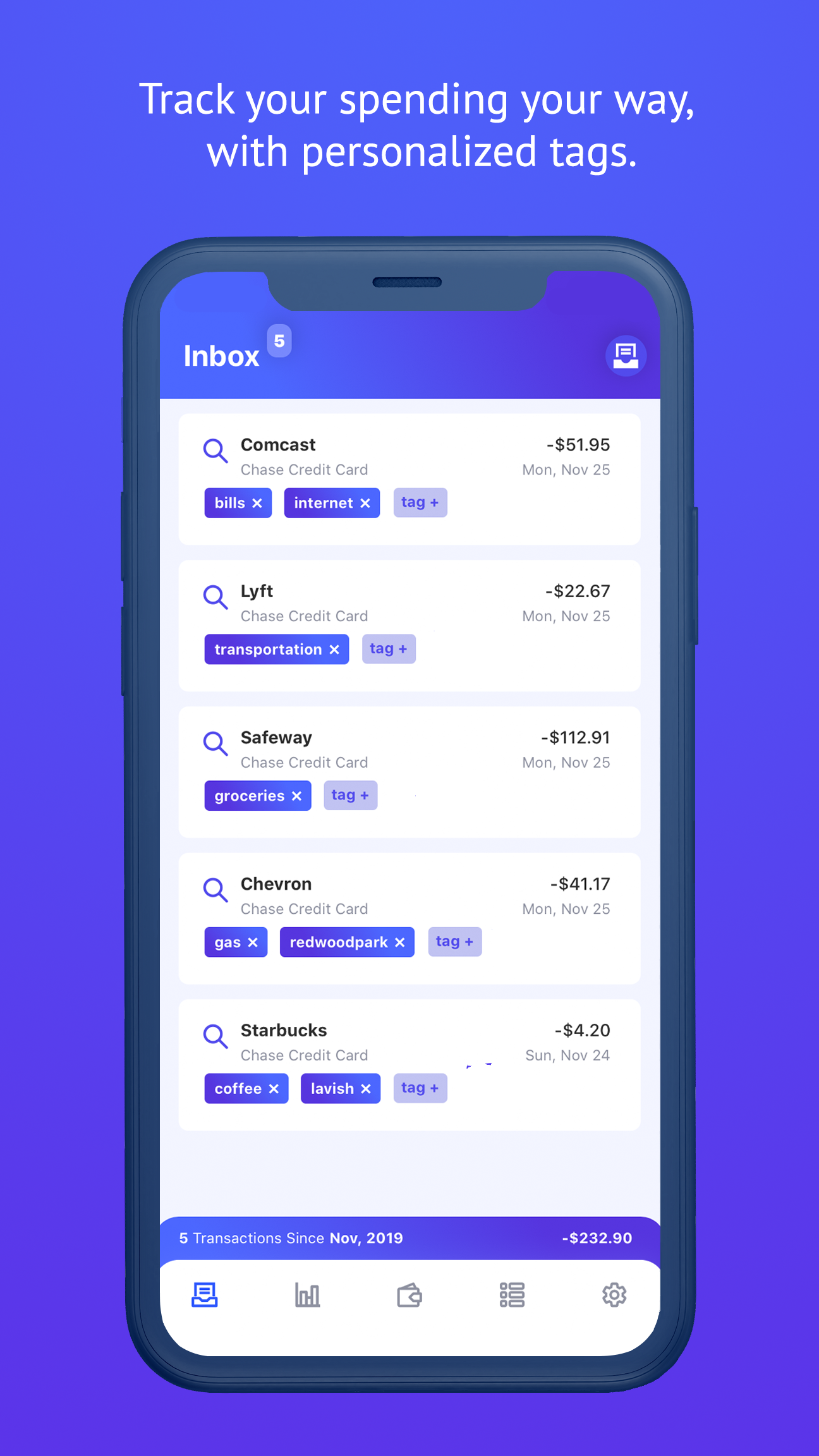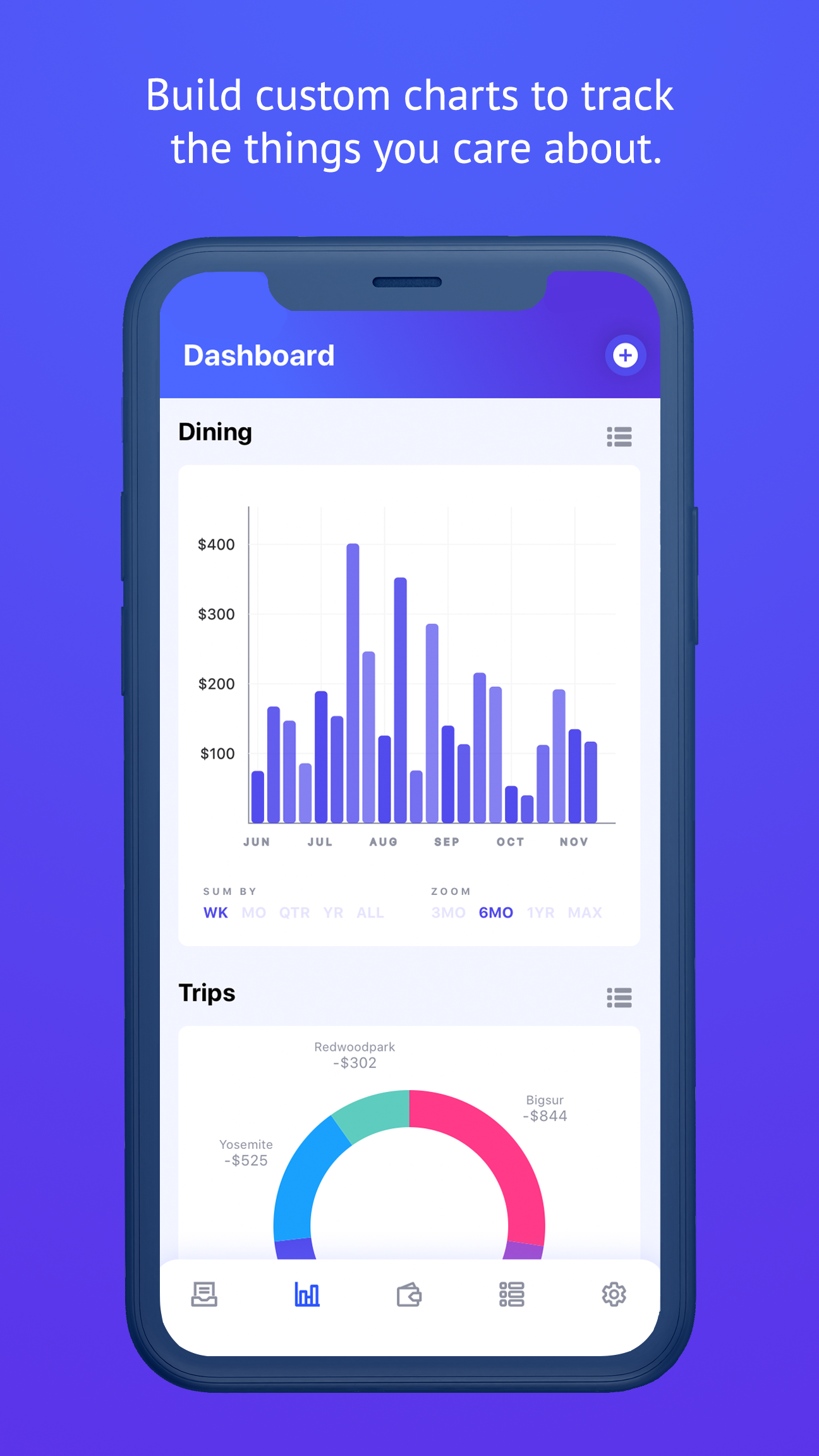 Centsibly gives you unmatched flexibility and control over how you track your spending. The app makes it easy to create custom charts, budgets, alerts, and tags to help you recognize patterns, set data-driven goals, and make smart decisions on the go.