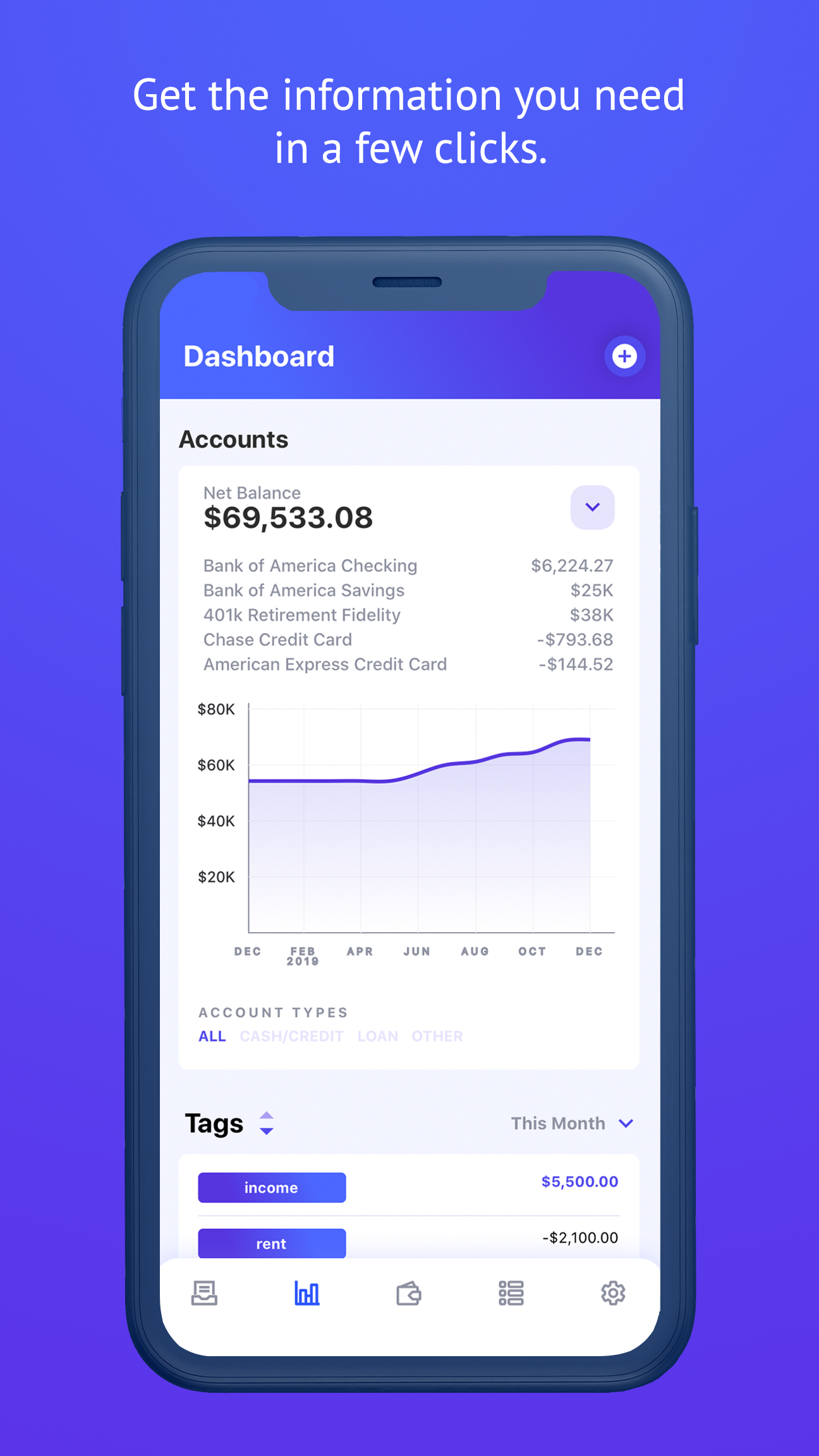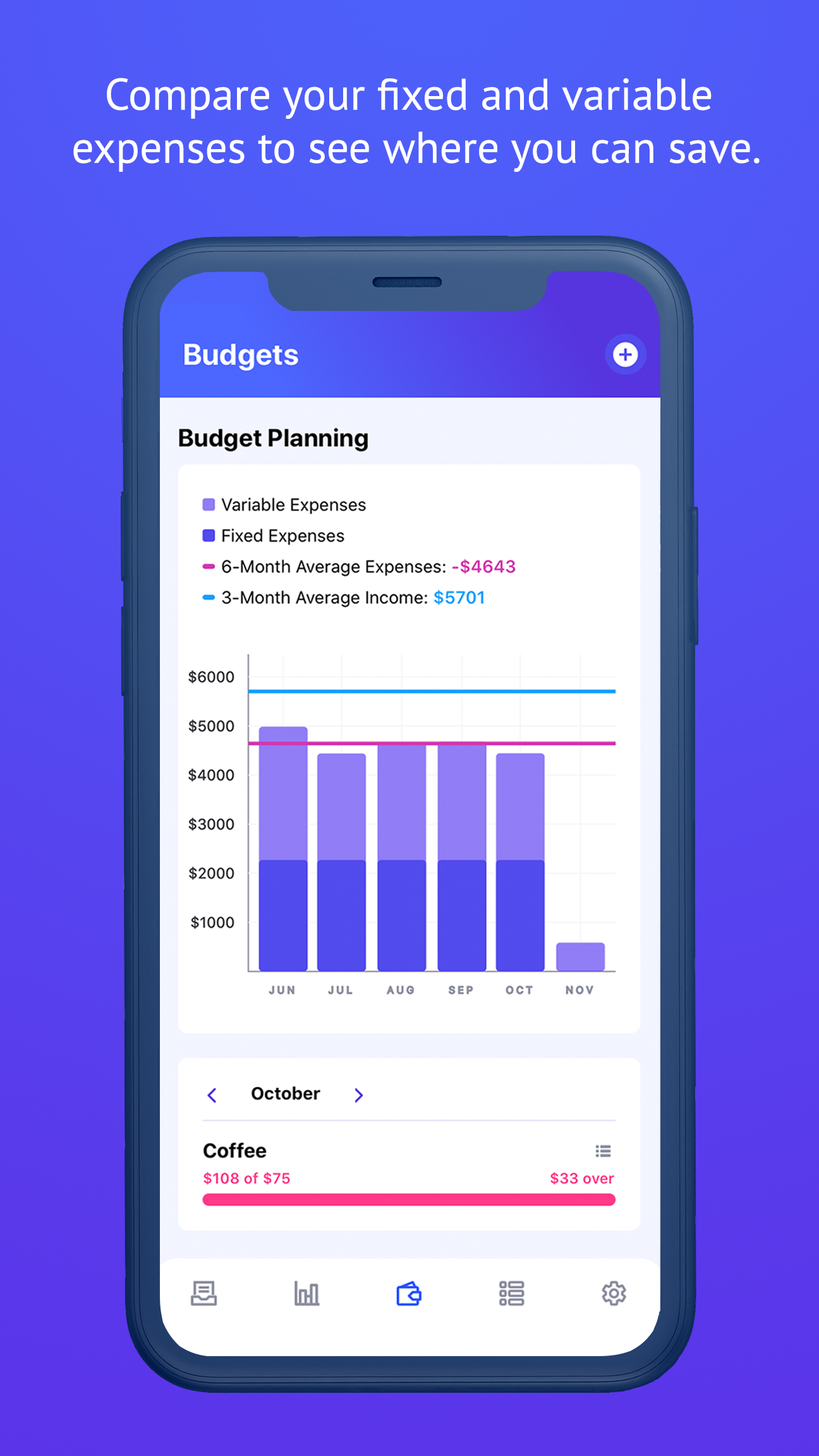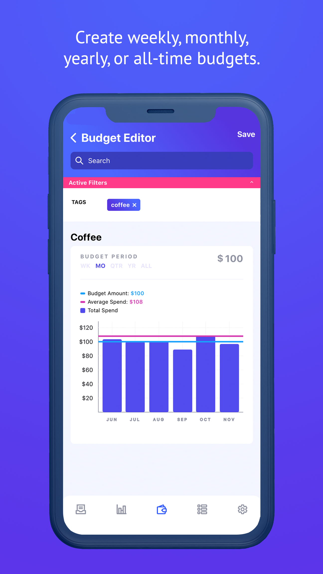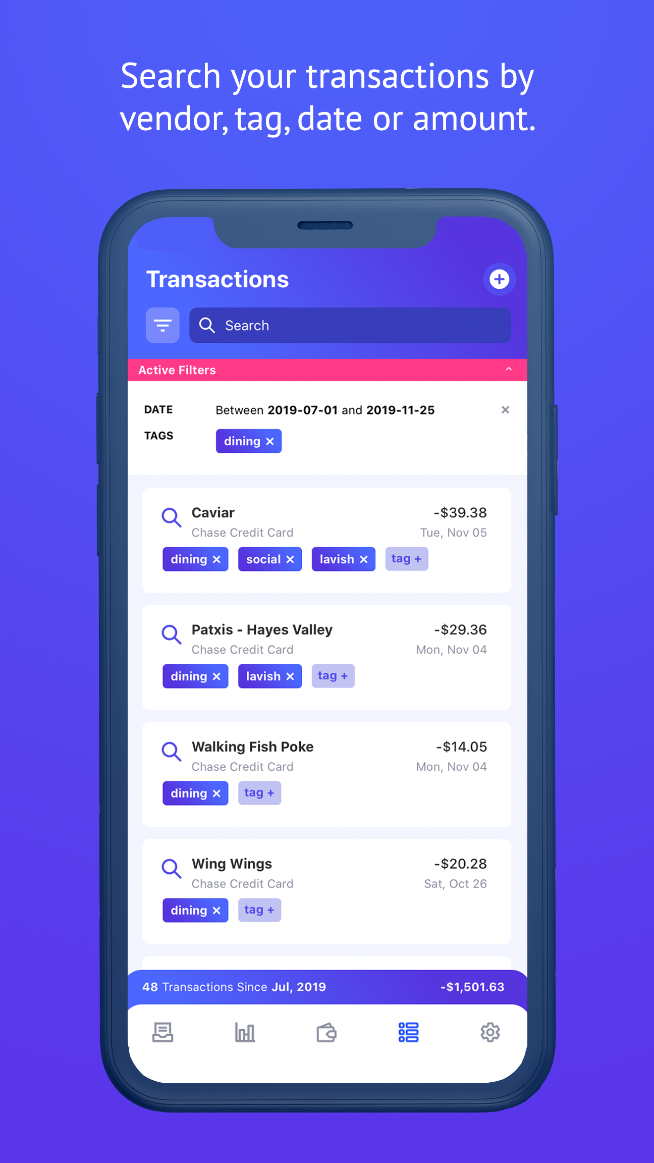 Centsibly gives you unmatched flexibility and control over how you track your spending. The app makes it easy to create custom charts, budgets, alerts, and tags to help you recognize patterns, set data-driven goals, and make smart decisions on the go.