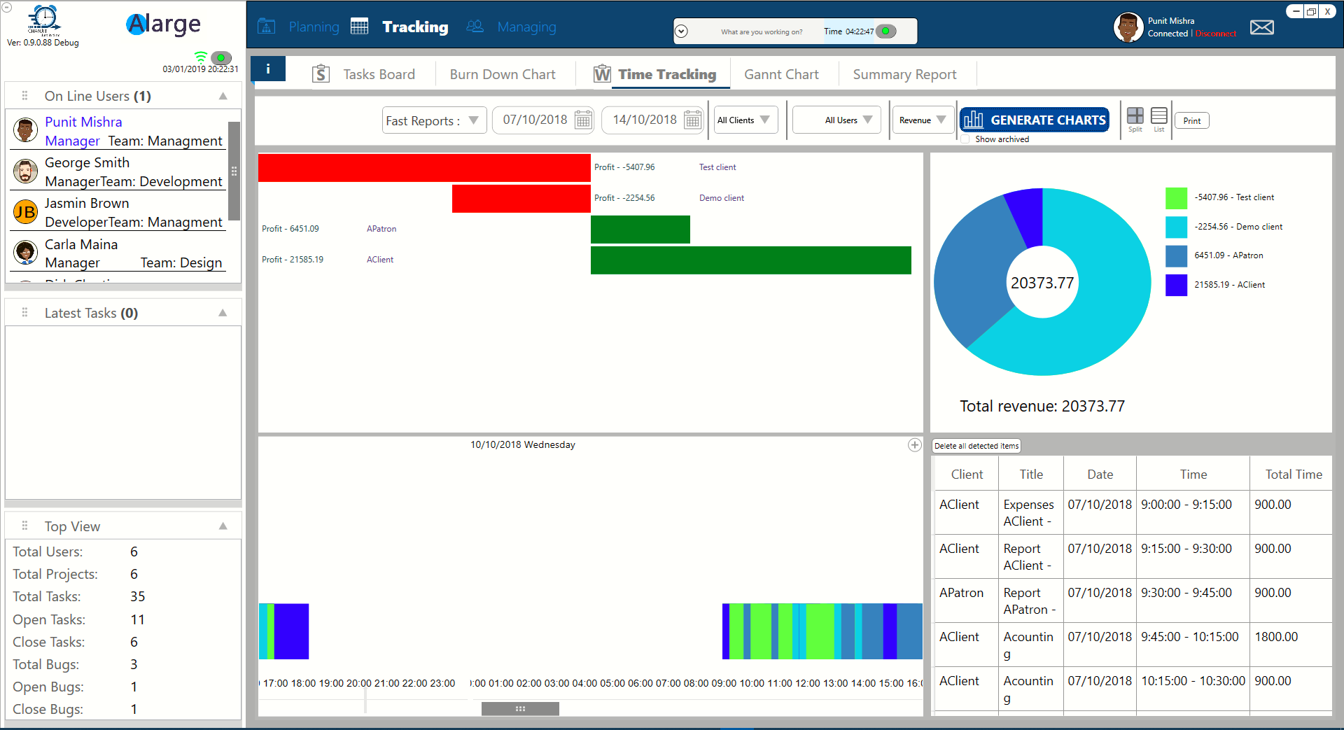 What is ChanJit Chanjit is a multi-tier productivity improvement software for the office that includes automatic time tracking, task management and project management. How does it work? The software is installed at each employee or manager station and after an initial input of the company's clients, the software will be able to monitor the total working hours and effective working hours on tasks and clients from each station automatically. The software knows how to produce profitability reports and employees effectiveness reports, by calculating the cost of employees and work hours, and help you spot bottlenecks and problems In addition, the system is also an advanced task and project management software with advanced tools such as real time taskboard, gantt and burndown charts to help managers and employees to always be updated on new tasks, delays and so on and act in real time. Although there are time-Tracking software out there, there is no software that can automatically associate working time on any window or software directly to the client or task. ChanJit knows how to automatically extract effective working hours from any software, and therefore knows how to generate unique profit reports for each client or employee.