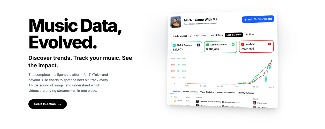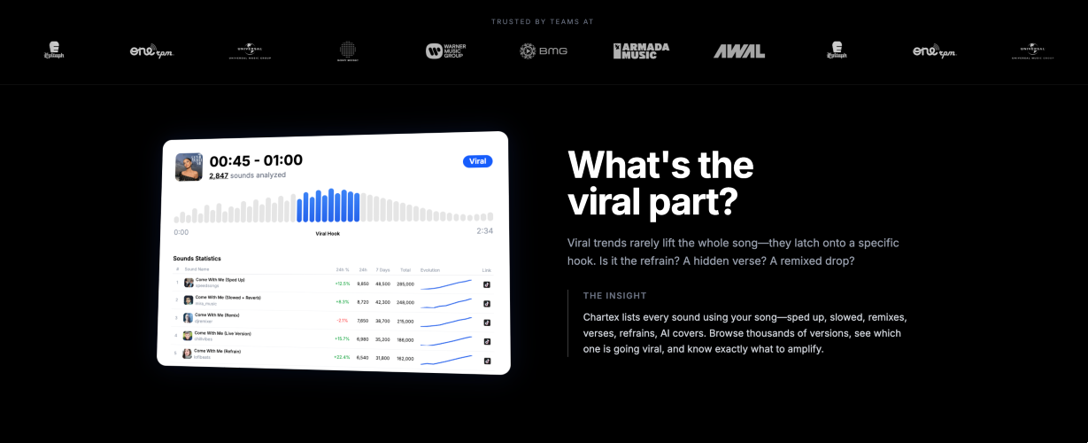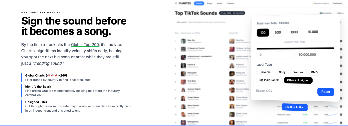 Chartex is a platform to discover sounds and songs and track how they evolve across TikTok, Instagram Reels, Spotify, YouTube, and Shazam. It identifies which version of a song is going viral and whether it actually converts to streams. Built for record labels, artists, and music industry professionals. Key features: - Discover trending sounds on TikTok before they go mainstream - Track songs and artists across Spotify, YouTube, TikTok, Shazam, and Instagram Reels - See which version of a song is driving growth - Monitor streaming data, playlist placements, and chart positions - Analyze cross-platform performance in one dashboard
