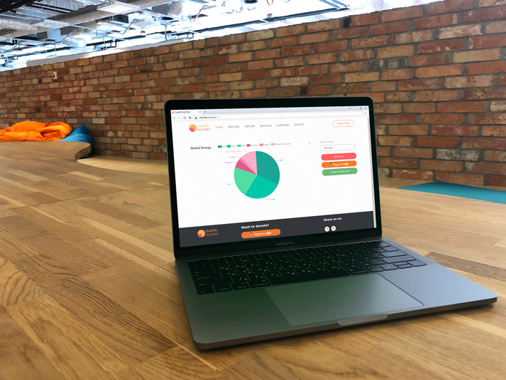 Charts Factory is a free chart generation application for students, employees and anyone who wants to play with charts. You can create various chart types like bar, horizontal bar, line, area, pie, doughnut, funnel and pyramid. You can also download them as an image or create a link and share it with your friends/colleauges. There are 13 different themes, change the theme use them in your presentations/homeworks. Please feel free to enjoy it, surprise us with your charts :)