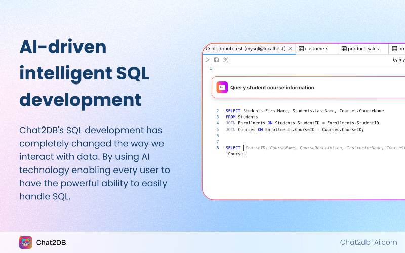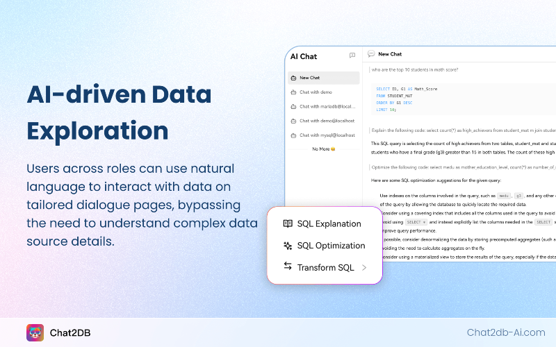 Multi-database support: Supports 16 types of databases, including common relational databases like MySQL, Oracle, PostgreSQL, and non-relational databases such as Redis and MongoDB. AI capabilities: Supports NL2SQL, SQL interpretation, SQL optimization, SQL Copilot suggestions, and generating test data. Reporting: Supports the construction of 8 types of charts and also supports AI-powered one-click report generation.