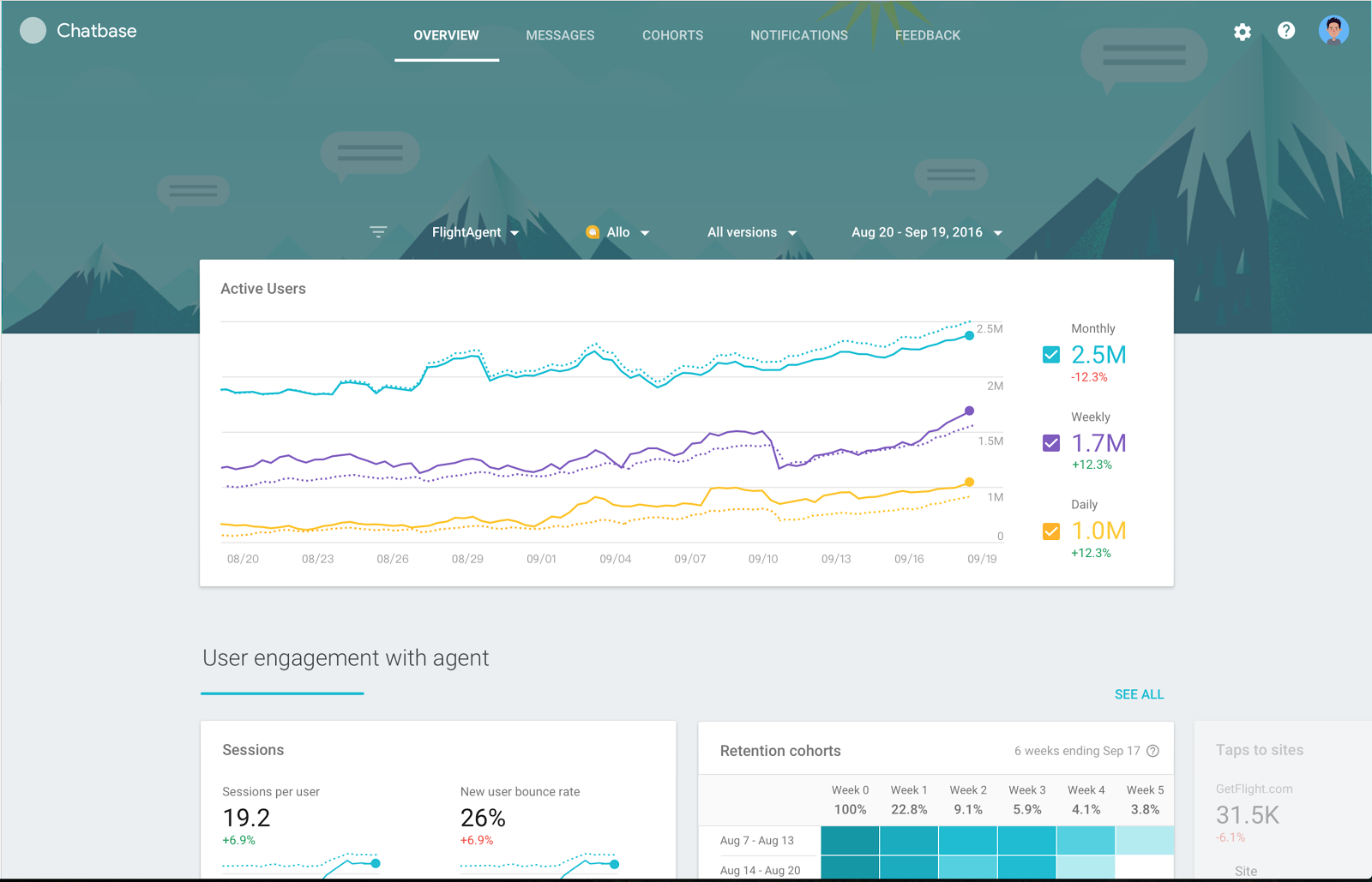 Chatbase is a cloud-based analytics service for builders of conversational interfaces, or chatbots. It helps those builders more easily analyze and optimize their bots for better consumer experiences than ever before. Chatbase is free to use, easily integrates with any chatbot platform, and works with any type of bot, voice or text. Using Chatbase, bot builders can track key health metrics across multiple platforms, identify and optimize user messages that are not handled well, and visualize the flow of conversations to improve conversion rates. Chatbase is now generally available. Just login, set up your bot, and get going! You can view a sample bot to see how your data will look once in Chatbase.