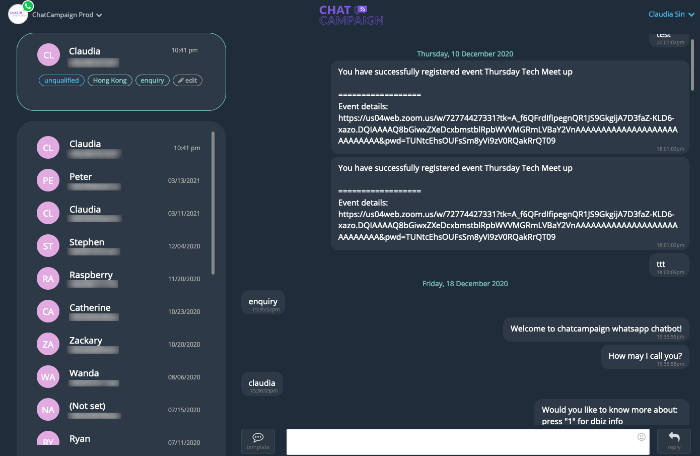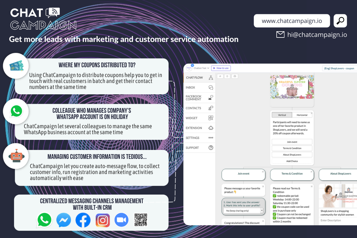 All-in-one marketing, customer service and AI platform on managing chat channels such as Facebook Page Inbox and WhatsApp. Marketing Hub: 2-way interactive marketing chatbot with loyalty program and coupon management. ?Customer Service Portal: Centralized chat history with quick message templates and work flow management