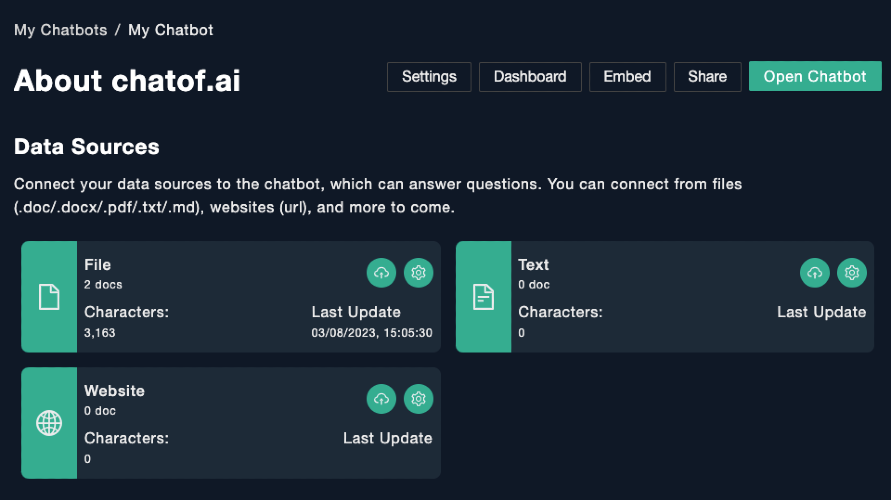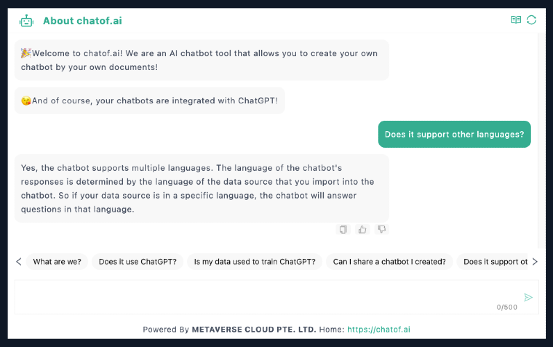 Chatof.AI is user-friendly and requires no coding knowledge. With its intuitive drag-and-drop interface(even Scanned PDF is supported too) and the ability to input URLs for web scraping, you can easily train specialized knowledge for your own chatbot. You can share it, or embed it as a widget, to everywhere. Everybody can chat with it. The entire process takes only 5 minutes. 1. Intro Employees in organizations frequently face time-consuming repetitive queries regarding IT, administrative, and HR matters. Our product, chatof.ai, was developed using OpenAI to address this issue by automating responses, freeing up valuable time for employees and eliminating the need for any programming knowledge. 2. What it does No coding required, our friendly drag-and-drop interface allows you to train your chatbot with specialized knowledge effortlessly. 3、Features Create your chatbot: Give your chatbot a name, and set welcoming messages to make it more engaging. Specify where the chatbot can be used. Data Sources: Effortlessly import your data, including Files (Docs, PDF even Scanned PDF , Markdown, Txt), Plain text, or crawl Websites (Website, Sitemap, URLs). Debug/Monitor your chatbot: debug your chatbot by references and adjust your data sources, review chat history and user feedback in chatbot's dashboard. Embed/Share: Easily share your chatbot or embed it into independent websites, apps, web browser. It's extremely convenient to use. 4. Conclusion You can easily train specialized knowledge for your own chatbot within minutes