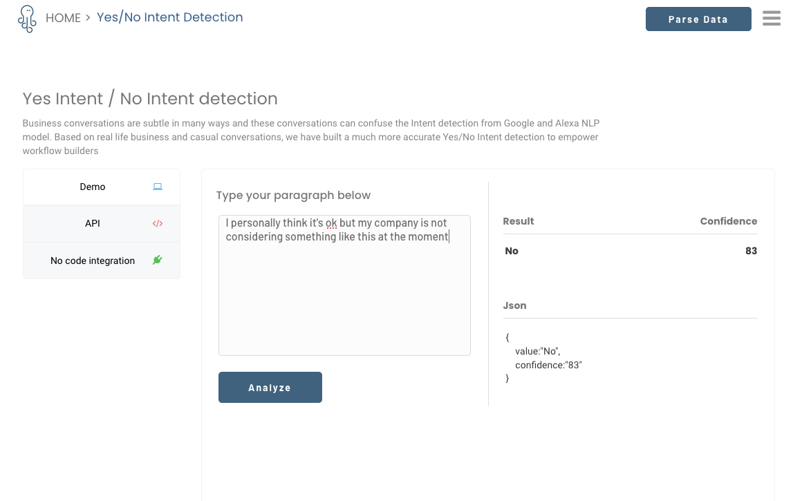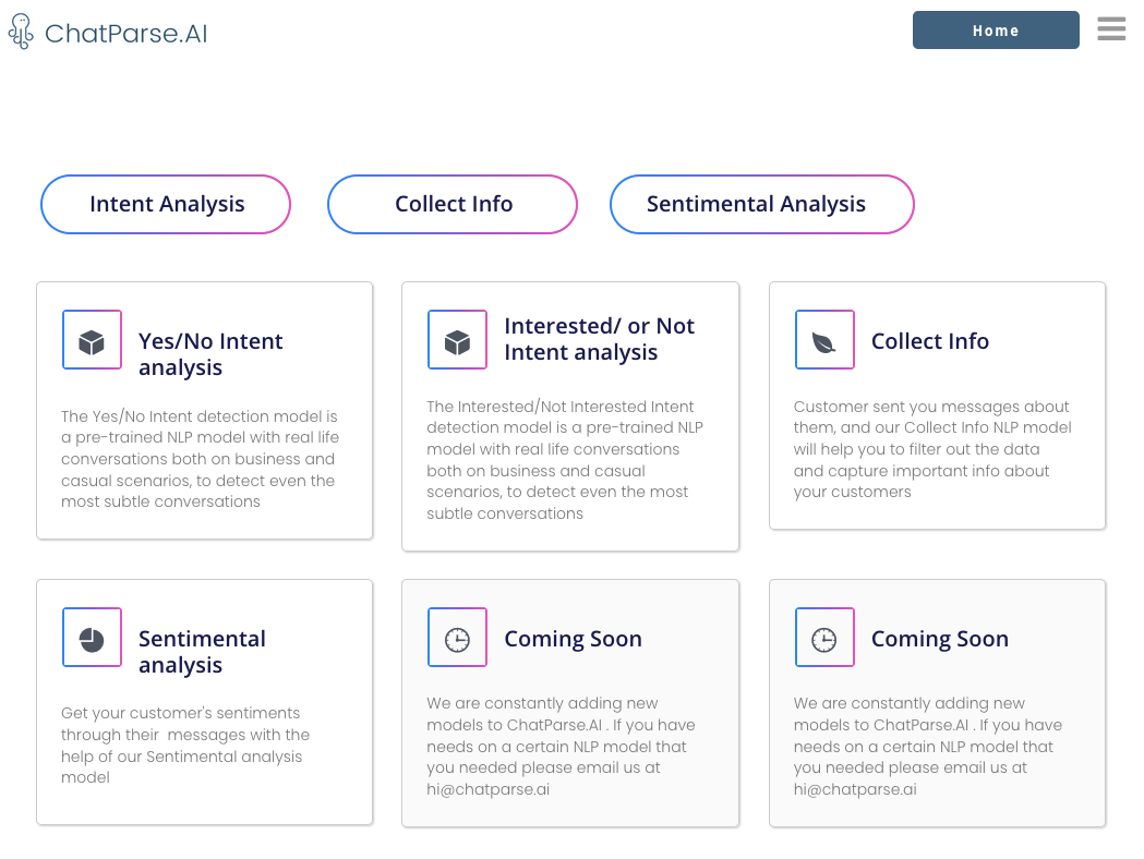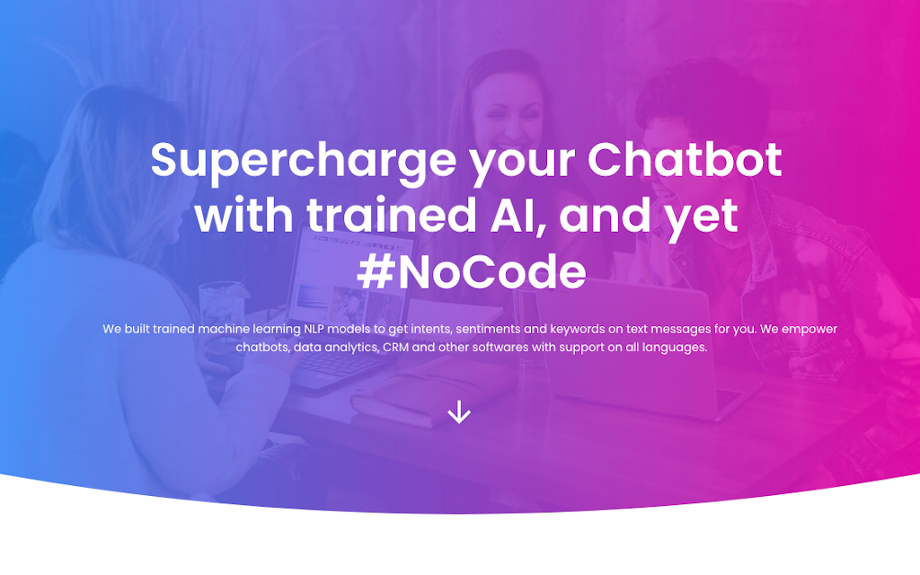 Provides NLP AI models which are ready to be used, no further training needed. For chatbot/CRM/auto-reply/auto-forward/auto-tagging/auto-everything after the AI categorizes what the user message is about. Other than restful APIs, it integrates with #nocode platforms like Bubble, Integromat, Zapier. Our AI supports all human languages. We also support customized AI models by request.