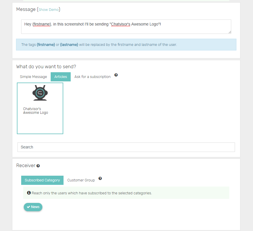 Chatvisor lets you send Newsletters & more on Facebook Messenger as a broadcast. The growth tools (e.g. comment watcher, subscription box, etc.) turn your community into Messenger subscribers. The article management (automatically) holds all information (e.g. all products of a web shop) and can send customized news to the right customers. Integrated analytics show how many people were reached, top interactors, most used languages and more. After clicking „Continue with Facebook“ it takes only 3 clicks to get started.