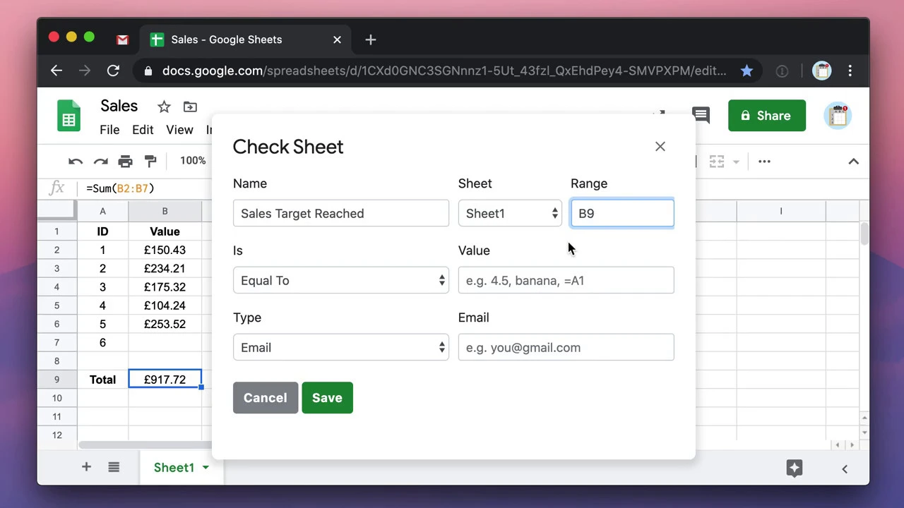 Google Sheets has basic notification functionality built in but it’s very limited. You can be sent an email notifications when any change is made to your sheet either straight away or as a daily digest but you can’t specify the type of change that should trigger the notification. This is where Check Sheet comes in, Check Sheet allows you to create “checks” that will inspect your spreadsheet every time it changes and if your check matches it will send you a notification. For example you could create a check that looks at the sum of your sales column and sends you an email when it reaches your target. It makes it easy to keep track of your goals, the progress of a project or whatever you can think of.