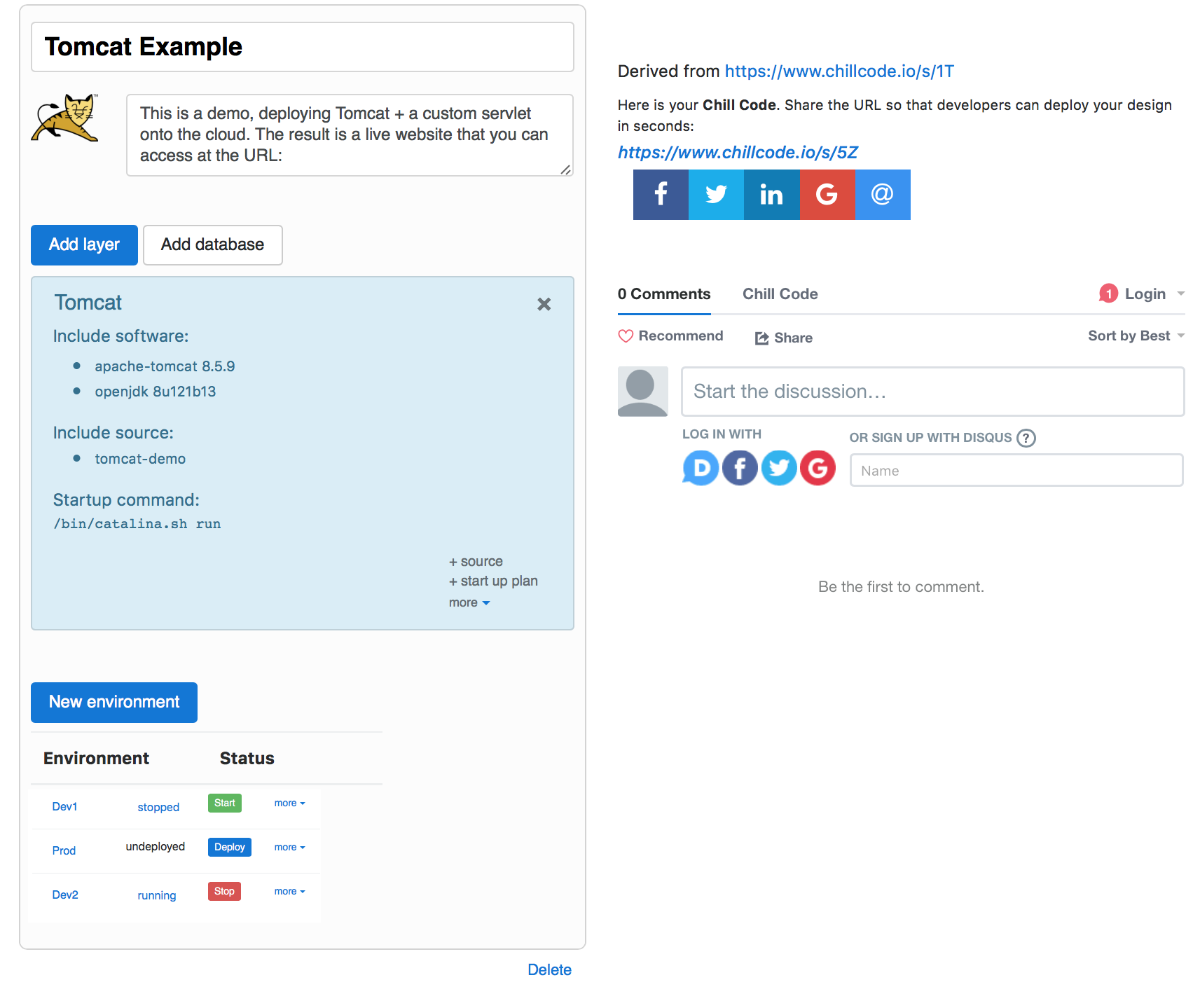 Chill Code helps developers easily find & quickly launch, software infrastructure popular within their technology community. Developers don't build TCP stacks or vector graphic libraries from scratch any more - we share common source on GitHub. Chill Code does the same for software infrastructure patterns. Developers search and select software from our library (over 10,000 packages) provide configuration parameters and start up commands, and list GitHub repos they want to use When you launch, Chill Code instantiates servers on AWS or GCE, installs the software, pulls down any source from GitHub and configures & starts each piece of software inside its own Docker container. Developers can fork each others patterns and usage statistics are available on the project page.