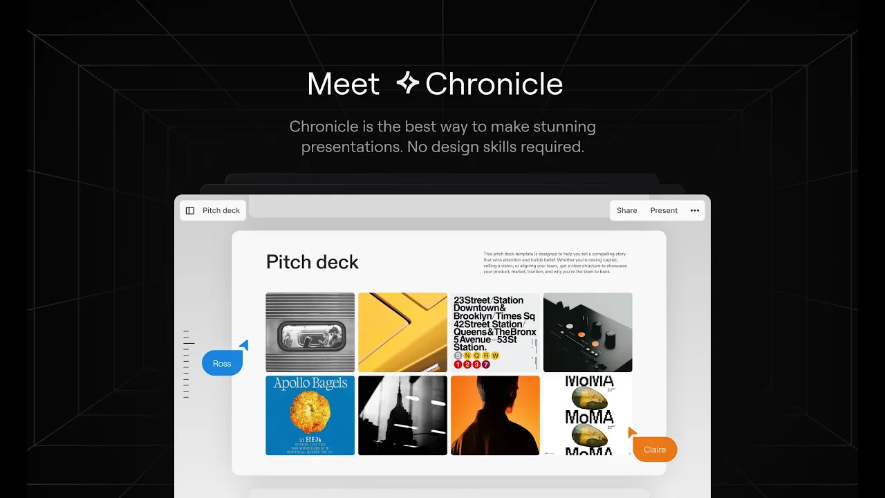 Chronicle combines AI with taste to help you go from raw thoughts to polished presentations. Designed for serious work: Start with templates, create with AI workflows, and collaborate with your team to shape your ideas into impactful narratives.